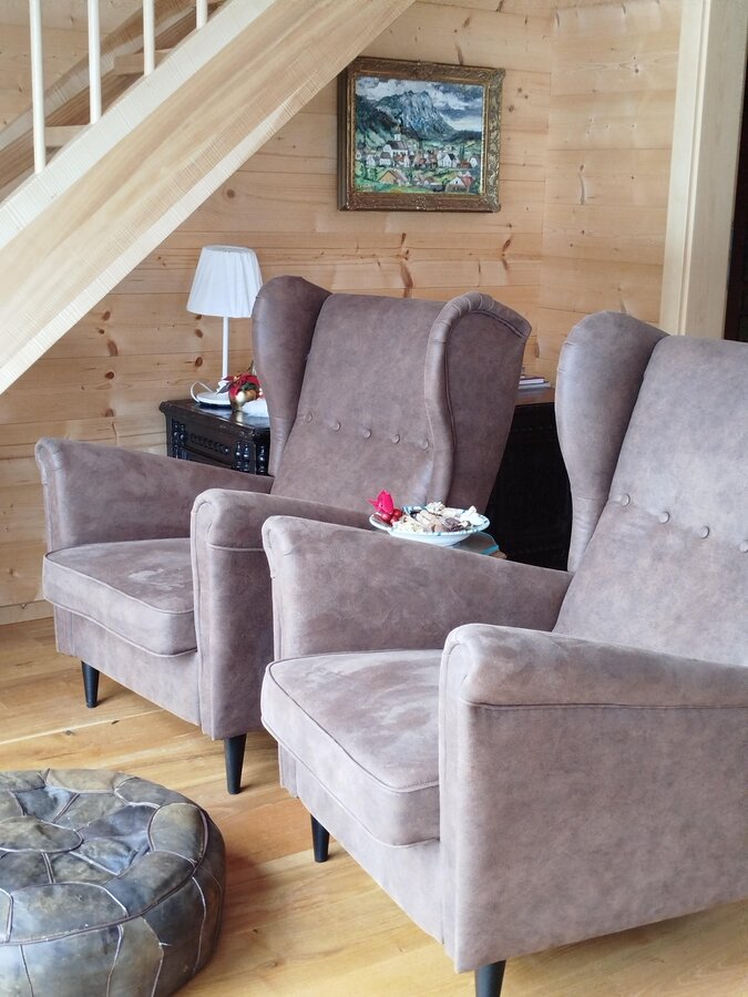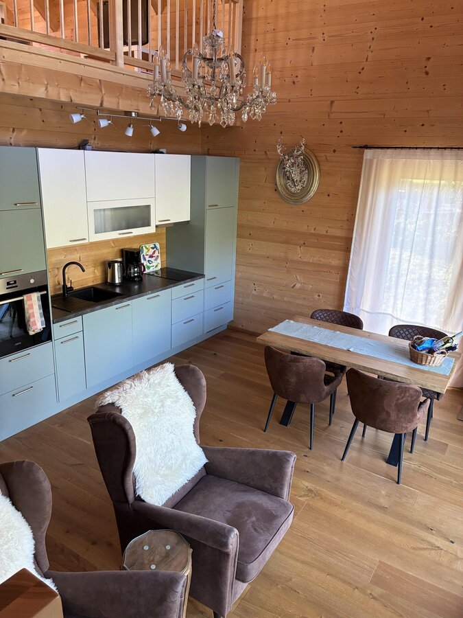 On the ground floor, there is the bedroom, bathroom with shower, WC, storage room for skis and ski boots, and the very well-equipped living kitchen with a comfortable armchair. A narrow staircase leads up to the spacious gallery with exposed roof beams, where you will find a comfortable sofa, as well as beds for up to 4 additional people.