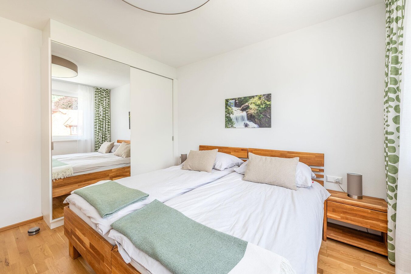 The tastefully furnished "Neualm 5" from myNests in the heart of Schladming offers space for up to 6 people. With its modern charm, the apartment provides a cozy, relaxing atmosphere with 2 bedrooms (double beds) and a sofa bed in the living area. You have a beautiful view of the mountains from the spacious terrace – perfect for mild summer nights. The apartment features two bedrooms with flat-screen TVs and a fully equipped kitchen with a dishwasher, oven, and coffee maker.