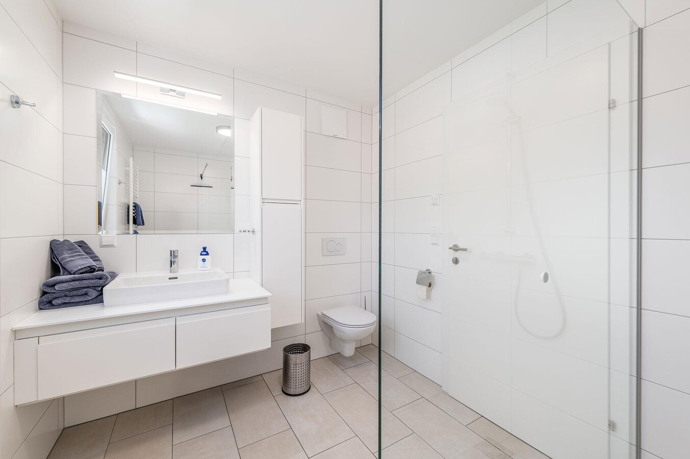 The bathroom is equipped with a generous shower and a sink. Towels and bed linen are provided.