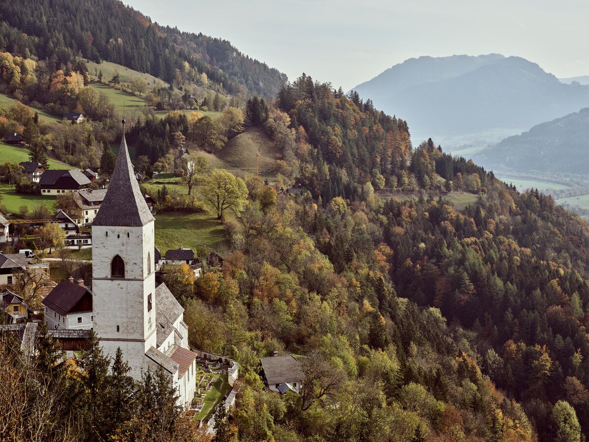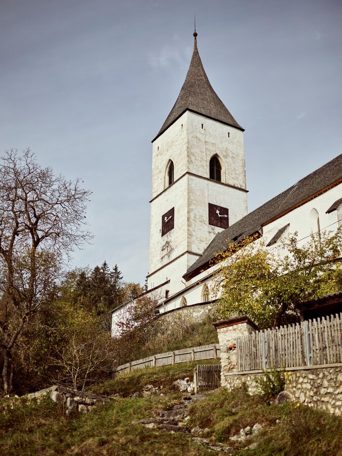 The burial hall of the Counts Lamberg was built onto the west façade in 1904. A special feature is the west portal with the Romanesque door leaf, which bears spirals of wrought iron to ward off evil spirits.