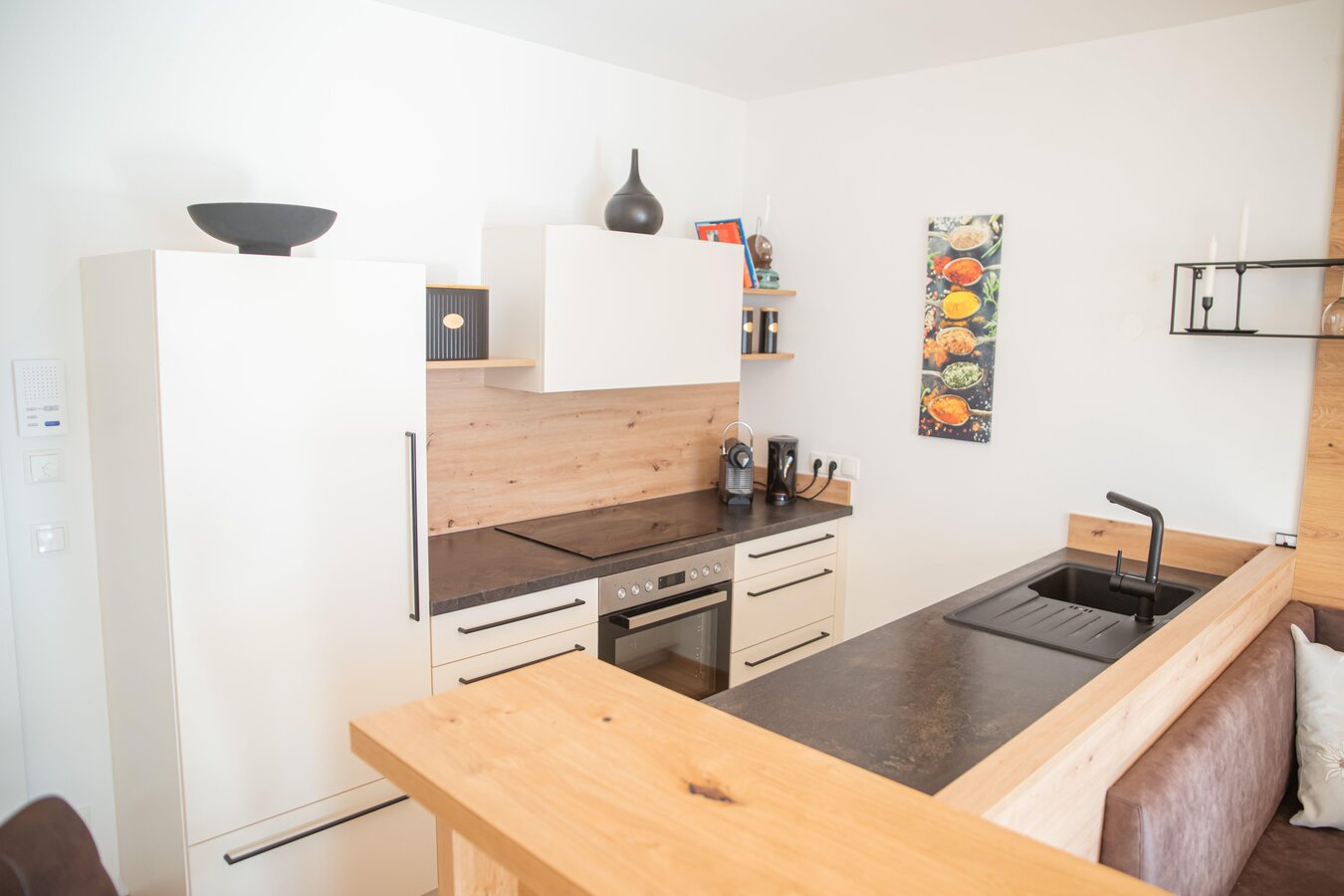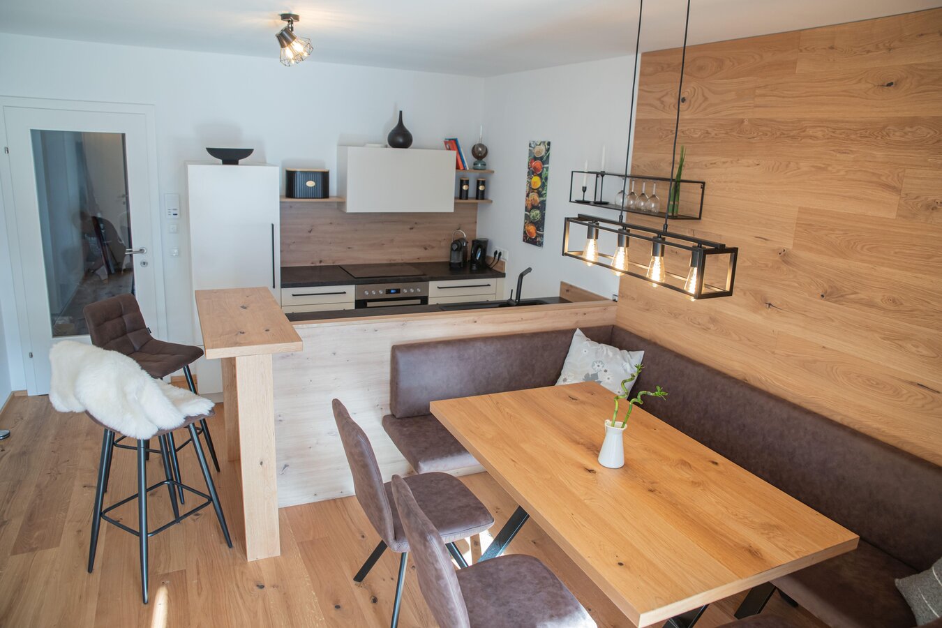 Through the living area with a pull-out couch and 4K Smart TV, you access the balcony with a direct view of the ski slope of the Planai.