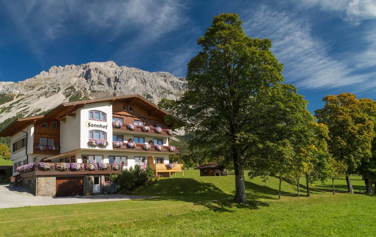 Welcome to the Sonnhof – Your family-friendly guesthouse located in the holiday region Ramsau am Dachstein near Schladming-Dachstein. Absolutely beautiful to pass enchanting holidays surrounded by wonderful meadows and unique forests. Situated at 1250m above sea level the Sonnhof unites hospitality, a relaxed atmosphere and comfort. Enjoy the clear air in the middle of the Ramsau mountain area of the Dachstein during a beautiful walk or just relax by using the comfortable deckchairs in the house own meadow. It takes around 20 minutes of walk through the breathtaking panorama of the Dachstein to reach the center of Ramsau. You choose between comfortable equipped double rooms, family rooms or Apartments. All rooms/apartments can be reached easily with the new elevator. Indulge yourself enjoying our rich breakfast buffet. At the Sonnhof you have the possibility to do sports inside or outside the house. Afterwards you can relax in the house own sauna area and revitalize your energies. We, the family Perner, are pleased to welcome you at our house, the Sonnhof.