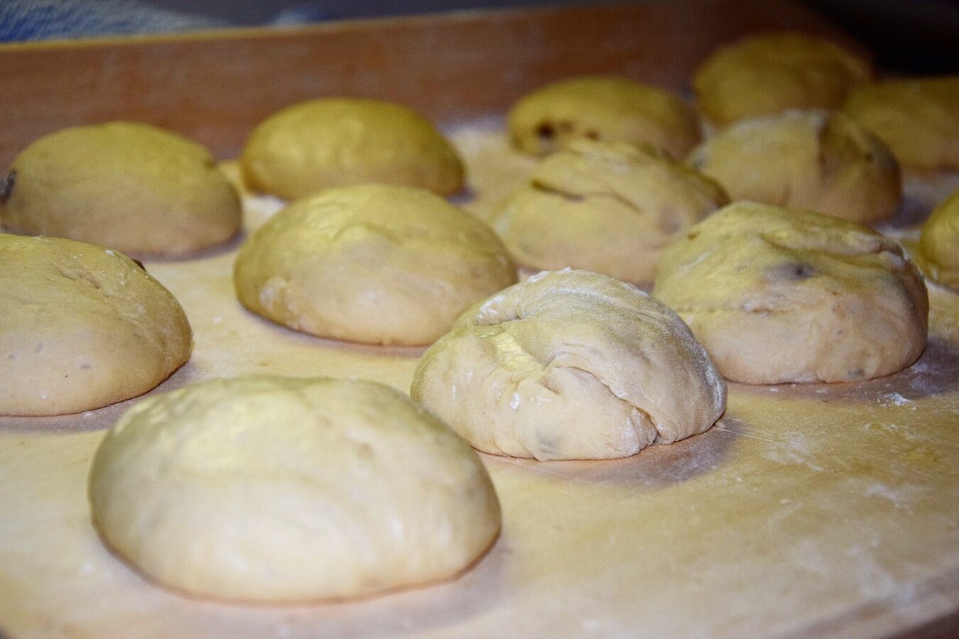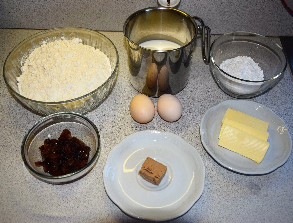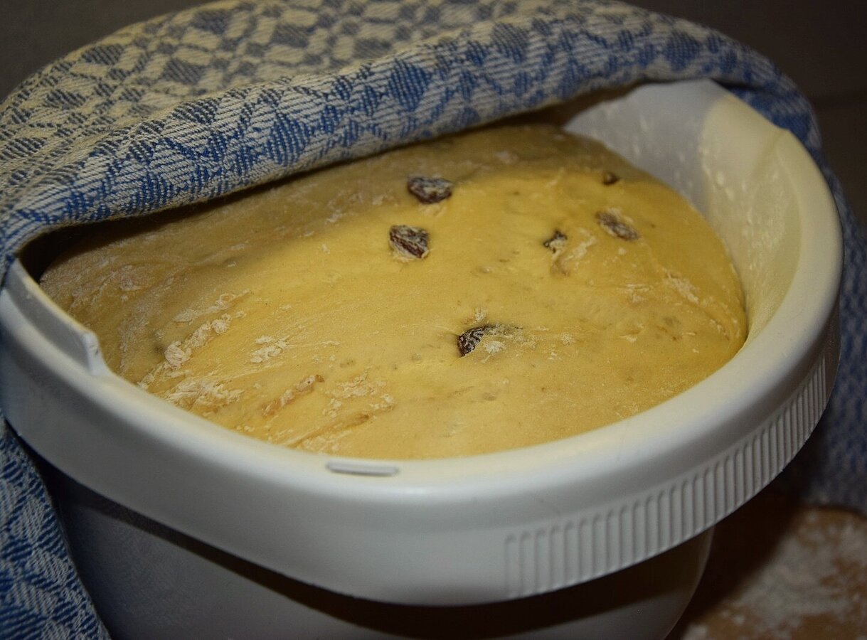 - Once the steam has risen a little, it can be added to the flour and mixed with the butter-milk-egg mixture and raisins to form a smooth dough. If the mixture is a little too sticky, you can add a little flour to help. Our dough now needs to rest for an hour.