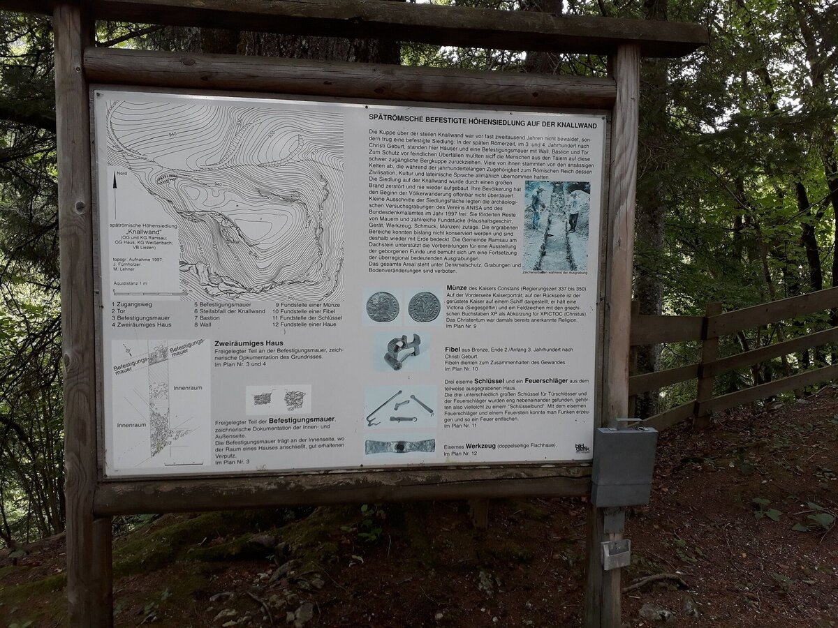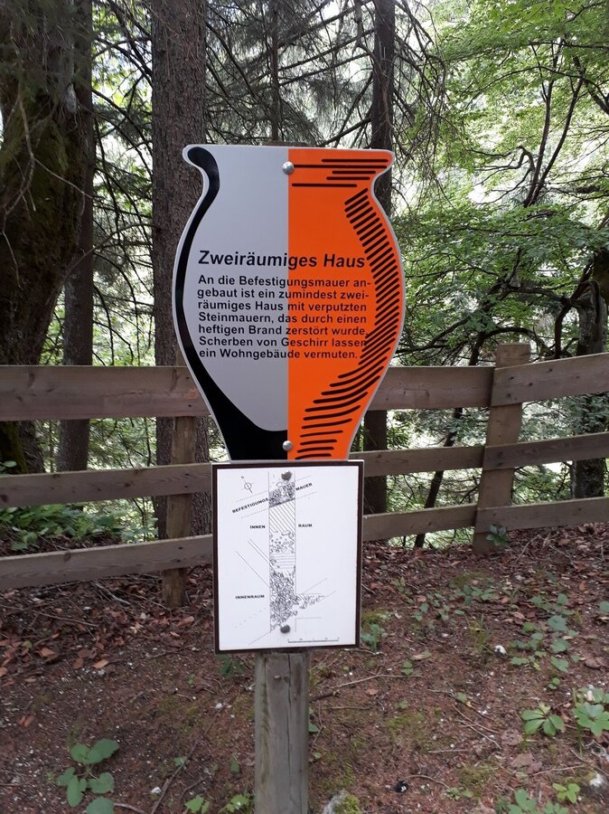 The only archaeology trail in the Enns Valley was opened in 2000 and is maintained by members of ANISA on a voluntary basis. It is a cultural highlight from the late Roman period. Here we can follow a tour through a late Roman retreat settlement. Signposts and explanatory panels tell us about life almost 2,000 years ago. At the beginning of the Migration Period, a refuge castle was built on the Burgstall in Rössing-Ramsau to protect against enemy raids. Excavations have unearthed rich evidence of life in this settlement. Remains of house walls and finds from everyday life provide evidence of a lively settlement in the late Roman period. This listed archaeological site is a 5-minute walk from the “Burgstaller”. The archaeology trail leads hikers up a steeply sloping hilltop to the south. Entry is free (at your own risk) and the site can be visited almost all year round.