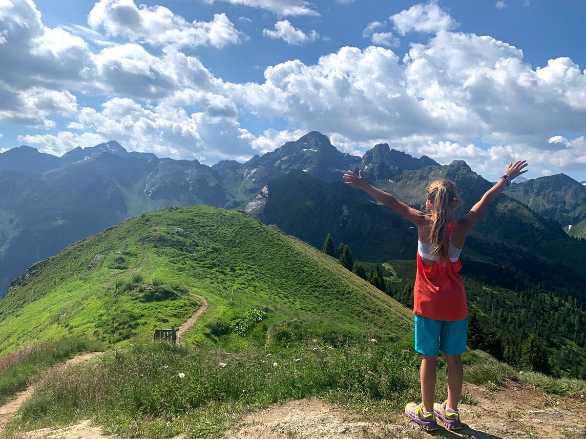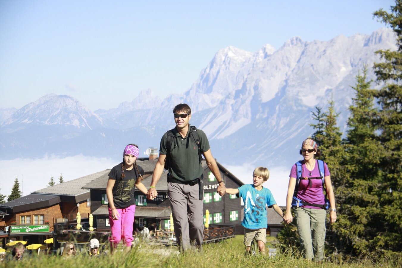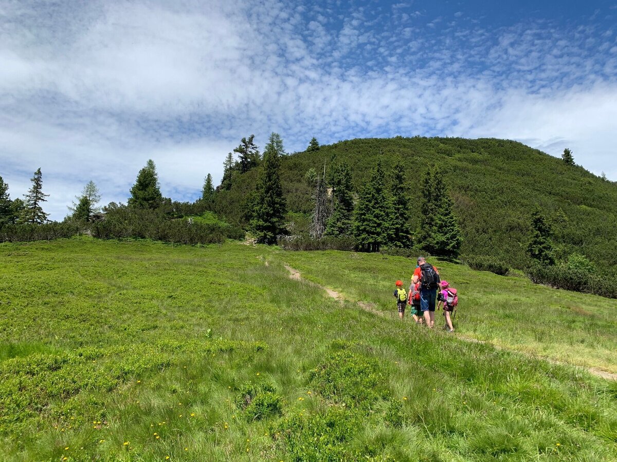 The great difference in altitude can be comfortably overcome with the Schladminger Tauern cable car or the Hauser Kaibling 8-seater gondola lift & the Kaiblinggrat 8-seater chairlift. A magnificent view over the entire upper Enns Valley awaits us. From the mountain station, we walk slightly uphill for a few minutes, where the Schafsinn circular trail branches off to the left at the TV station in an easterly direction. There we soon see the large “Schafbox”, the actual starting point of the circular trail. This is signposted throughout and then leads slightly up and down in a clockwise direction around the Hauser Kaibling to the Rossfeldsattel. From there, the trail descends gently to the Kaiblingalm. This is easily accessible for families with baby carriages from the other side via the forest path, which also takes you back to the cable car mountain station.
