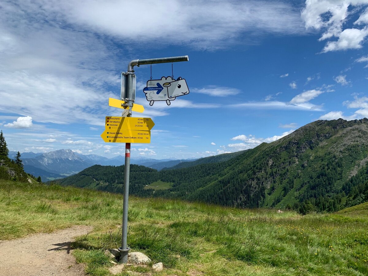 One part of this large overall project is the wonderful Schafsinn circular trail with special signage and sheep box in the area of the radio station on Hauser Kaibling. Starting from the village of Haus im Ennstal, you can enjoy the ride up to our Hauser Kaibling and embark on a hiking adventure with magnificent panoramic views of the entire Enns Valley. Along the way, you will be given interesting information about the EU Leader project Ennstal-Lamm and, with a bit of luck, you may even come across the 800-strong herd of sheep, including shepherd and dog. If you then announce your presence in the Schladminger Tauern by ringing the bell at the keep, you should remember the admonishing words “Nature alone gives you joy, devotion, love and loyalty. Protect it with heart and mind!”. The Schafsinn circular trail consists of an easy section for baby carriages and strollers and a moderately difficult section for sure-footed hikers. Of course, you can also walk the whole loop. And when it's time to take a break, our hut hosts at the Kaibling Alm, Krummholzhütte or TOMiziel invite you to stop for a bite to eat. The Schafsinn circular trail - a well-rounded experience!