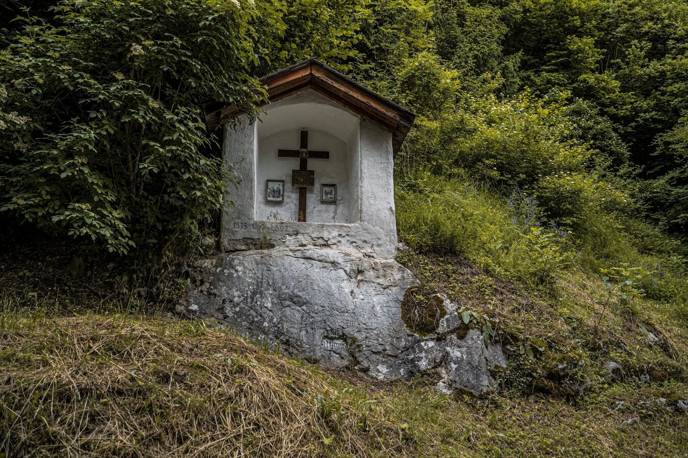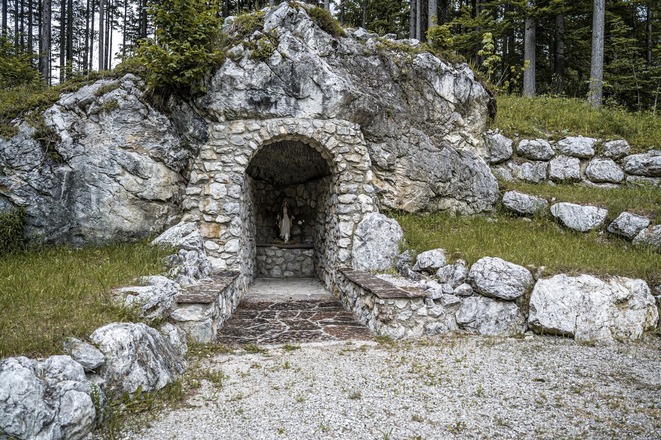 Your tour starts at Trautenfels railway station or in the neighbouring car park. From there, you hike up to Trautenfels Castle. At the local hiking portal, follow the signs towards the Neuhaus church ruins and Grimminghütte. You hike past the Raumberg-Gumpenstein Bioinstitut and the Neuhaus church ruins. The mighty Grimming mountain is visible in front of you the whole time. At the crossroads shortly after the church ruins, turn right and follow the marked path to Untergrimming. You will reach the small village and turn left onto the main road until the Kapuzinersteig branches off to the right.