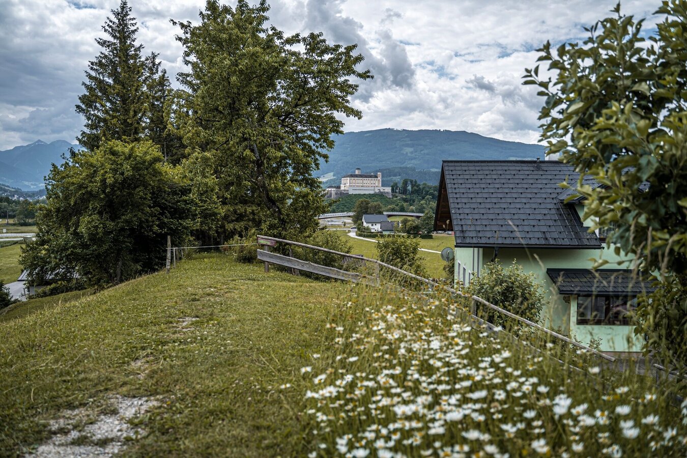 This will take you up to the village of Pürgg. Here it is worth visiting the parish church of St. George and the adjoining cemetery. The view down to the castle, the Ennsboden and westwards to the Grimming is impressive. Passing the Krenn inn and St. John's Chapel, you hike down from Pürgg towards Unterburg. You walk a short distance towards Stainach and then via the Schranz farm back to Trautenfels to your starting point
