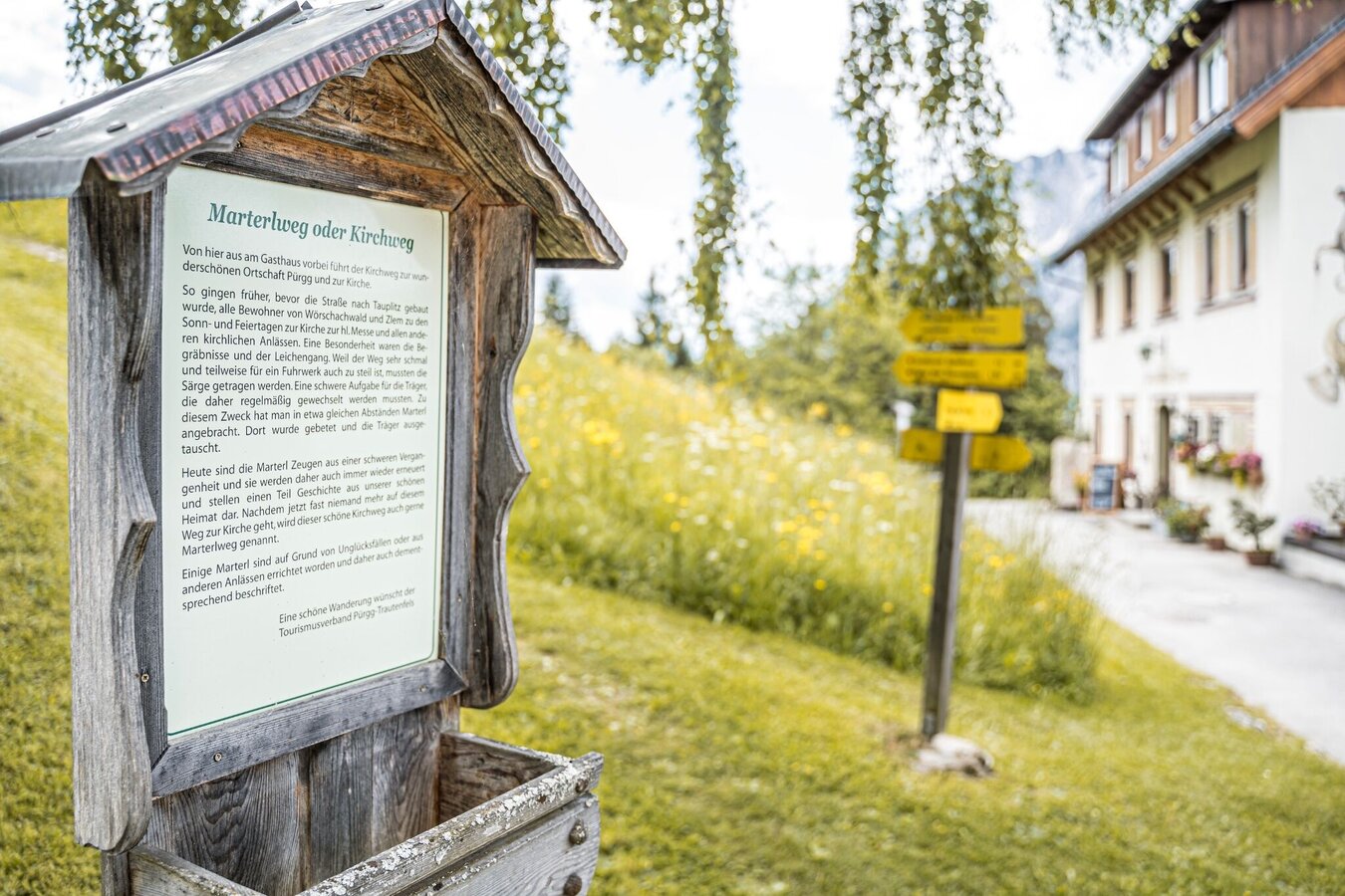 Short circular tour from the Lessern district up to the beautifully located Dachsteinblick inn. A section of the Marterlweg to Pürgg is also part of the route, where you will repeatedly come across small wayside crosses along the way. We return on a beautiful path above the Salzkammergutbahn.