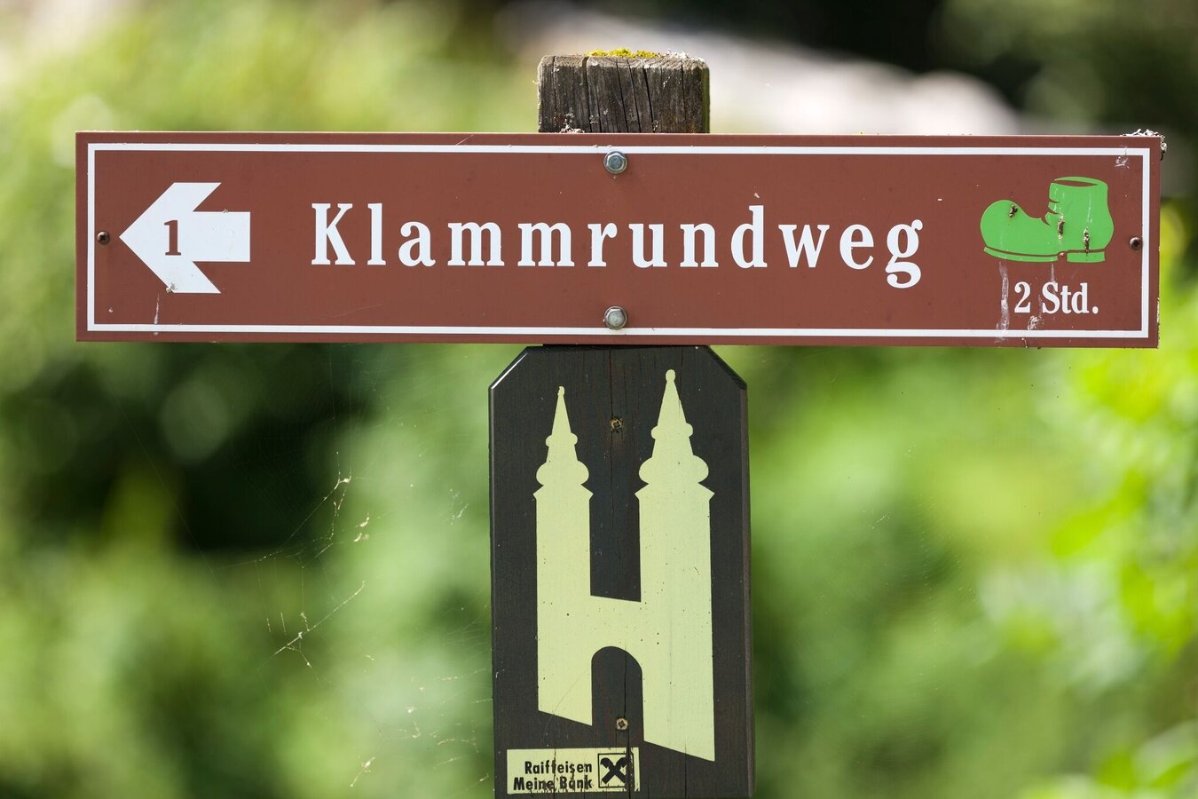 At Fuchsberg, you cross the B75 again and enter the Donnersbachklamm gorge - a highlight of the tour. The gorge runs spectacularly along the course of the stream and leads you back to Donnersbach. There, the route climbs up to the Rüschersiedlung and continues above the road through the forest.