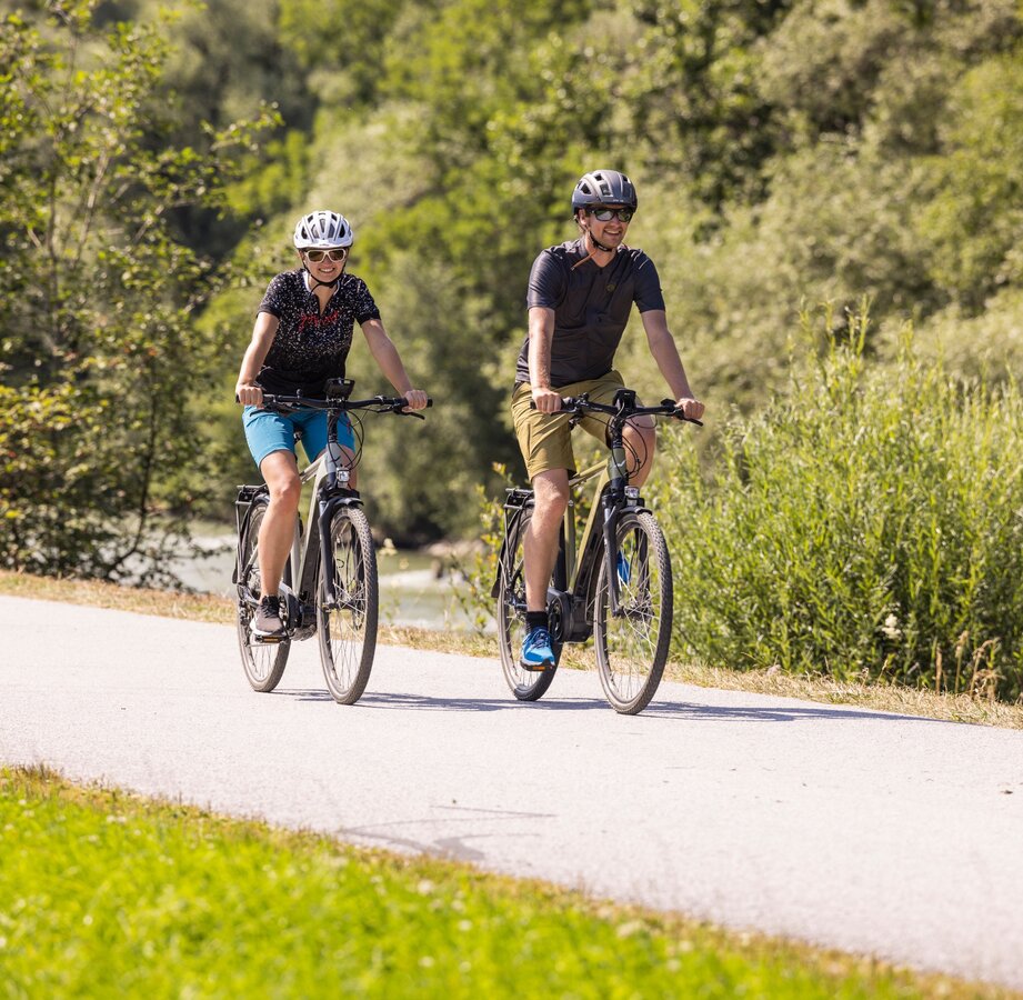 We cycle right along the Enns until we change banks after passing under the motorway access road. After 600 meters we have to turn right, pass under the motorway and then immediately left again. At the main road turn left over the Enns, then immediately right again. At the T-junction, which we come across after about one kilometre, our path leads back to the other bank. Are you interested in a more sporty alternative? Then you can turn left here. This route leads via Ramsau am Dachstein. In this case you won't get to Radstadt or Schladming. But if you are a racing cyclist, please note that the "normal" route along the Enns is not continuously asphalted, but the one via Ramsau is. However, if you have stayed on the main route, you will see the first houses of Altenmarkt after about two kilometres.