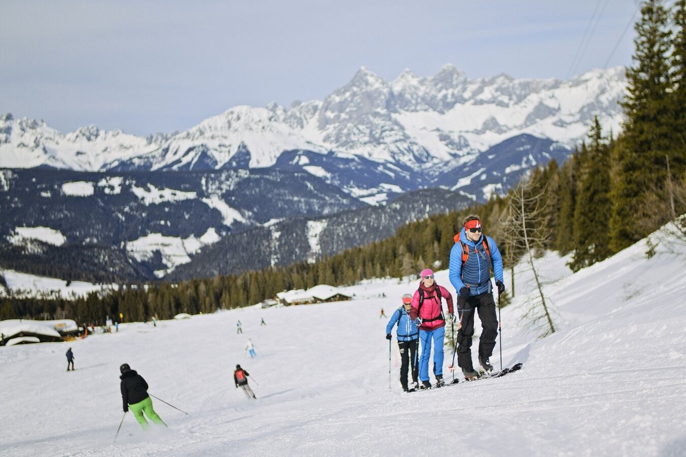 A technically simple piste ski tour for which you should, however, be a little more fit. With an vertical ascent of 900 meters and a length of around 7.5 kilometers, the tour is quite a challenge - especially for beginners in touring sports. You will be rewarded with a winter wonderland in the alpine pasture area of the Fageralm, a wonderful view of the imposing Dachstein massif and a hearty stop at one of the ski huts.