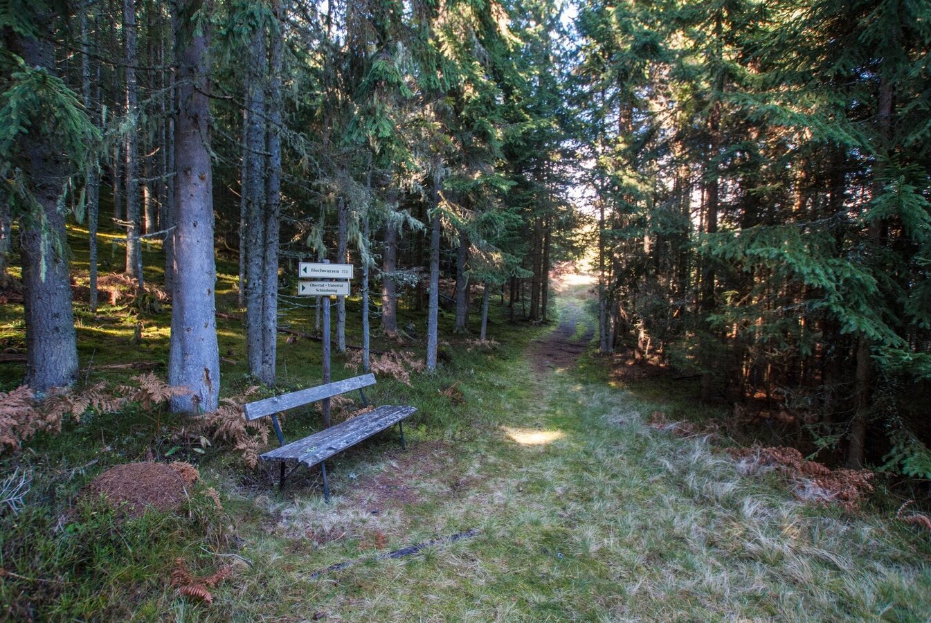 Walk down until the trail joins a forest lane and path n° 773, which you will follow further downhill. Just above farmhouse vlg. "Pocher" the trail exits from the forest at "Johannahöhe", where you enjoy a great view over the entrance into the valley of Obertal. Follow the trail downhill over meadows past the "Pocher" and "Andenbacher" farms, where you make a left and walk along the road (Ahornweg) until you reach the main road (Tälerstraße) at a hairpin. There you make a right and follow the path to Untertal village.