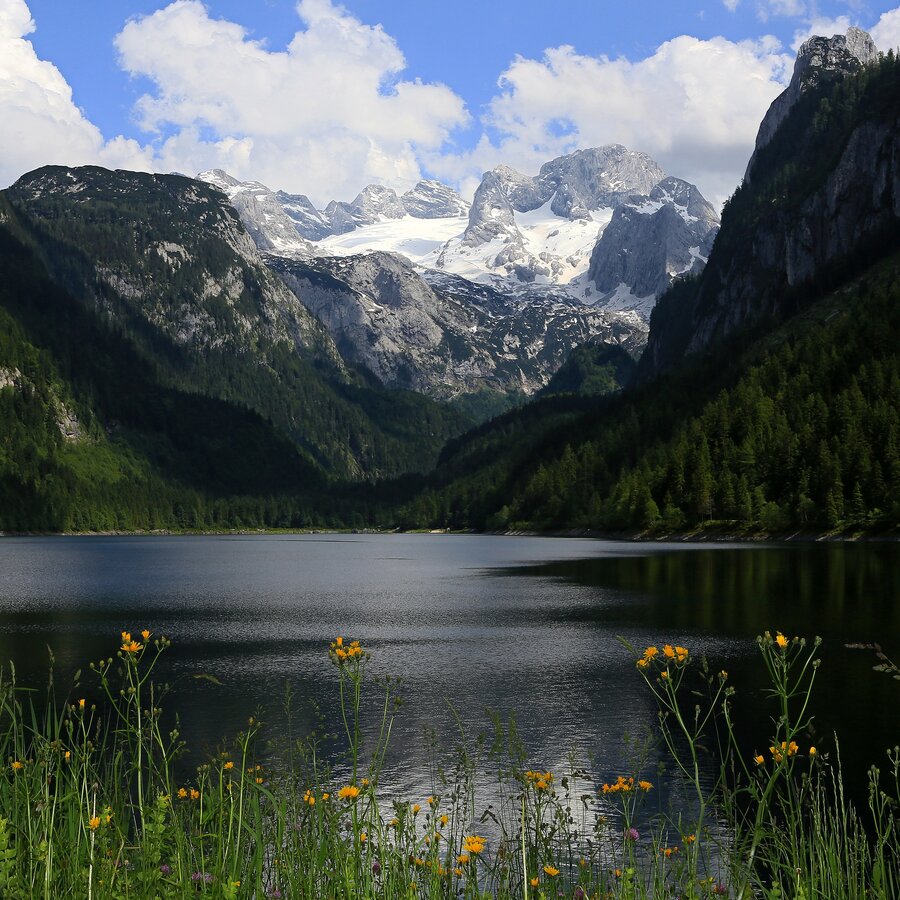 We start our tour at the parking lot of the front Gosau lake. We go on the hiking trail no. 620 under the lift route of the Gosaukammbahn in the direction of Gosausee until we reach the Gablonzer hut via light serpentines. From here we follow the Austria Weg 611 on meadow paths, from where we have a beautiful view over the Gosausee and the Törleck. We cross the border from Upper Austria to Salzburg and reach the Törlecksattel on 1557 m. From here we continue on the Austria Weg 611 along the south side of the Großen Donnerkogel until we pass the Stuhlalm. Then it goes steeply uphill and the path meanders between the rocks and mountain pines. After we have overcome this steep section it goes on a leisurely way a little up and down until we see our first stage goal - the Hofpürglhütte.