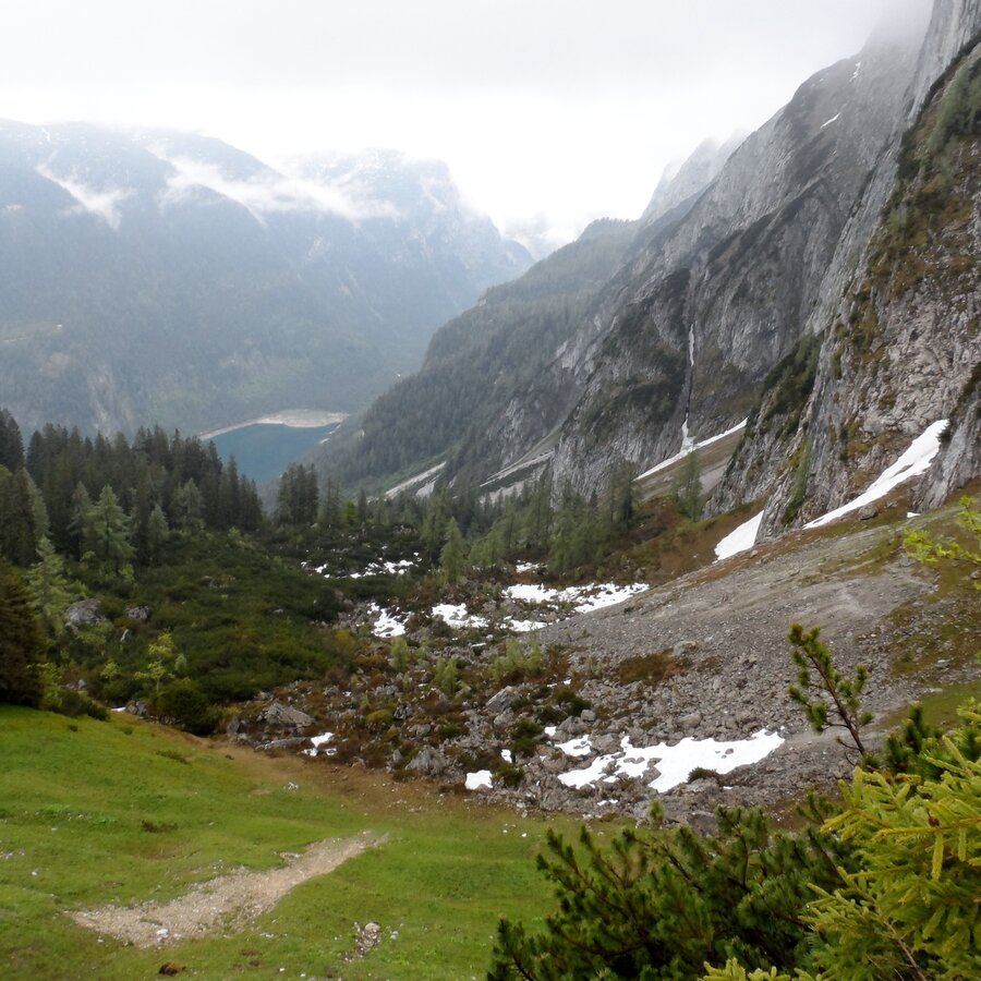The first section of the Dachstein circular hiking trail leads from the valley up to the first overnight hut of the stage tour.