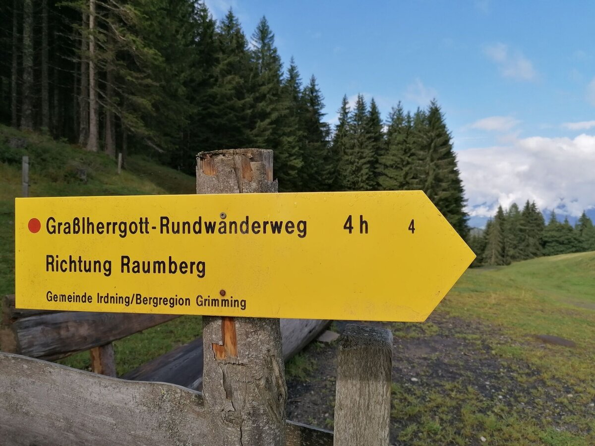 Coming from Schladming or Liezen, leave the Ennstalbundesstraße (B320) in Trautenfels and take the Donnersbach/Irdning/Aigen exit at the roundabout and continue to Irdning. Turn right at the crossroads in front of the Billa supermarket and after 1 km turn right again towards Raumberg. At the end of the village you will find the car park near the chapel.Small car park near the chapel
