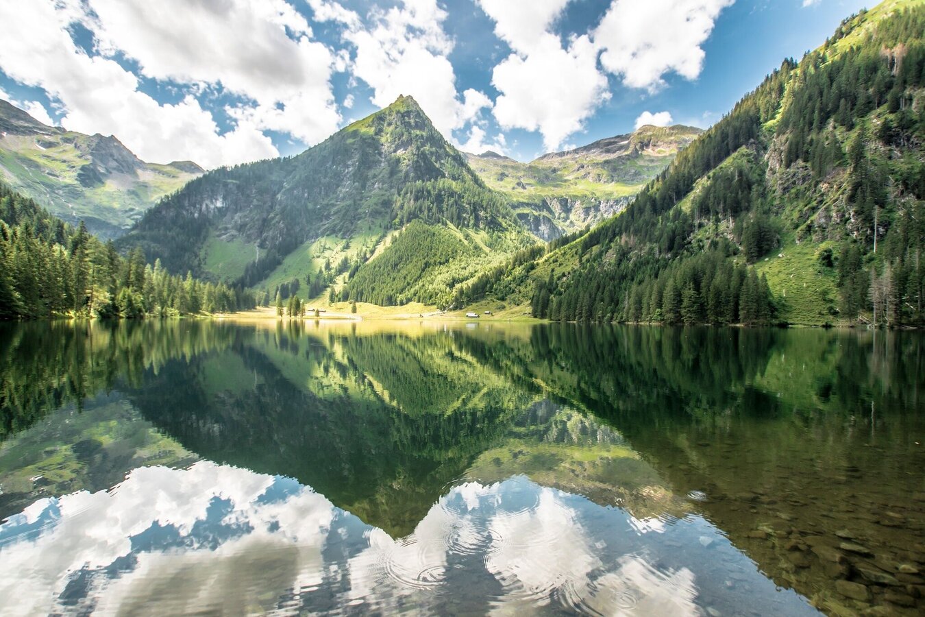 The further we drive into the Kleinsölktal, the more imposingly the steep forested hillsides ascend towards the peaks above. From the Breitlahn Hütte, a broad path takes us on an almost flat walk alongside the Kleinsölk stream to the Schwarzensee. Three sides of this lake are surrounded by dark forest, standing along the shore are a number of enormous, ancient alpine maples. And in good weather, whenever we come to a clearing, we can enjoy enchanting reflections off the lake.