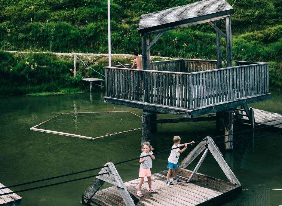 This is where the action is, or rather the fun. Right below the top station of the Riesneralm, young and old alike can dumbbell across the lake on a raft, scramble up and down the rocks, balance on the slackline (watch out, if you fall in, it gets wet!) or fish for wooden trout. The HochSEEsitz is located in the area of the mountain station.