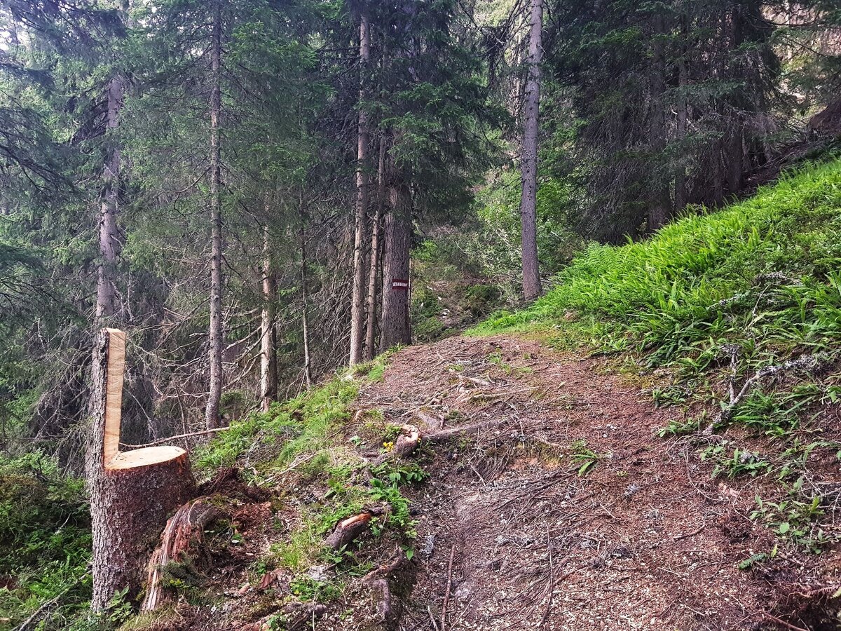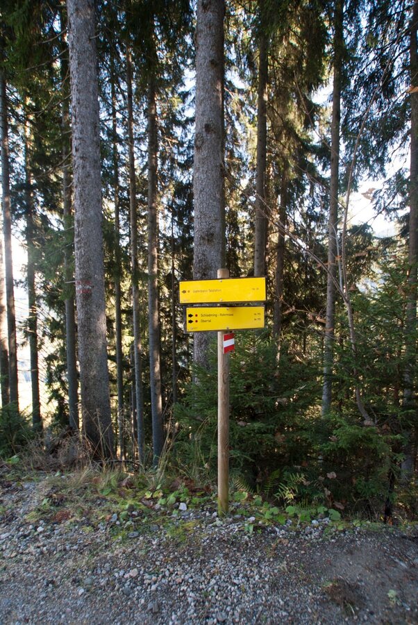 Eventually you run across a forest lane (hiking trail #773 and Laubschachen Trail join your route here from the right) and further downhill into a large clearing in the forest. You then reach another forest lane, right at a sharp bend in the road. This road (trail #61) takes you directly back to the valley terminal of Hochwurzen cable-car.