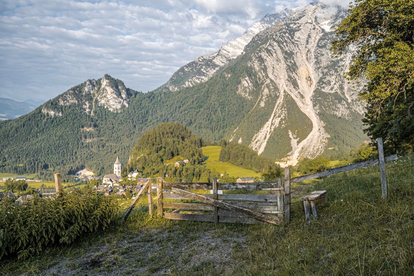 Into the village and left up along path #289 in the direction of Thaller/Kogelhalt and Brandangeralm. First along pastures, then through a sparse mixed spruce forest to Kogelhalt. The path is lined with different forest and meadow flowers. The route continues quite steeply to the Jagerbichl trail crossing below the Brandangerkogel. From here turn right to the Brandangeralm (unserviced), where you enjoy a beautiful view of Wörschachwald. Back to the Jagerbichl trail crossing and continue in the direction of the Schröflhütte. On the way there are beautiful views of Pürgg and Trautenfels Castle. At the Schröflhütte, the beautiful alpine pastures with benches invite you to linger. The way back to Pürgg is via the “Himmelsleiter” and past the Naturbad Pürgg.