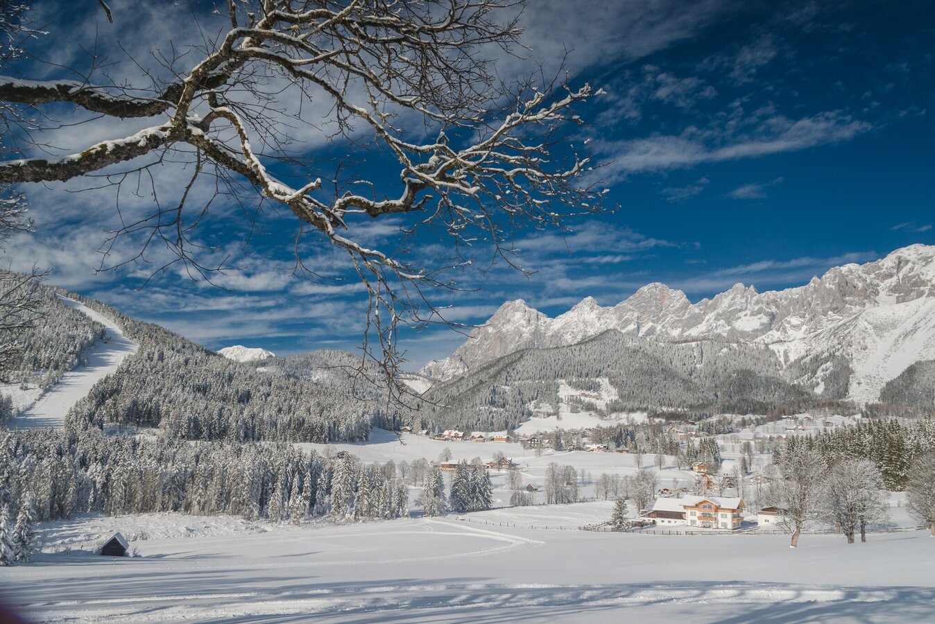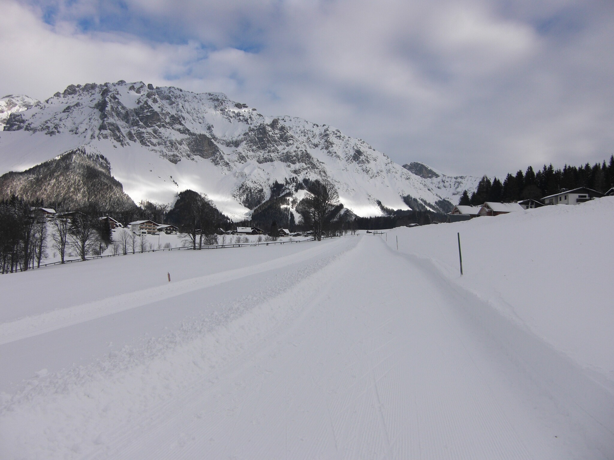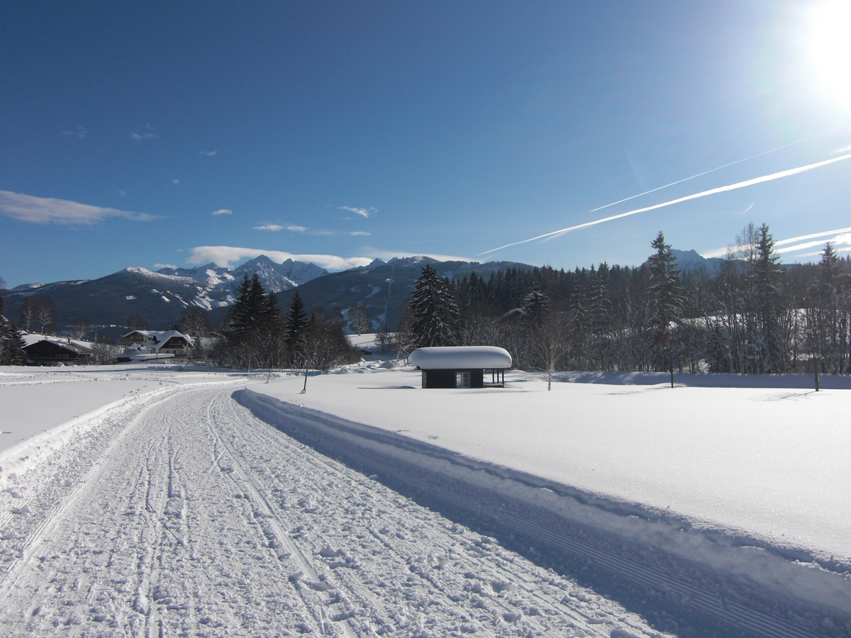 From the cross-country stadium, follow the path over to the ski jumping stadium and from there in the direction of Ramsau Kulm to Café Walcher. Cross the road and pass below the Kulm district to the Hotel Annelies. Continue to follow the signs for the Kulmbergrunde winter hike. Walk along the road to the village of Leiten. At the end of the village, the groomed trail begins, which leads you across the meadows on the foothills. Here you can enjoy the wonderful view of the Schladminger Tauern to the south. Walk past the Gasthof Stockerwirt and the Zechmannhof to the west side of the Kulmberg to the path junction a little north of the Gasthof Peter Rosegger. Walk past the Ederstube to Ramsau-Ort and back to the cross-country stadium.