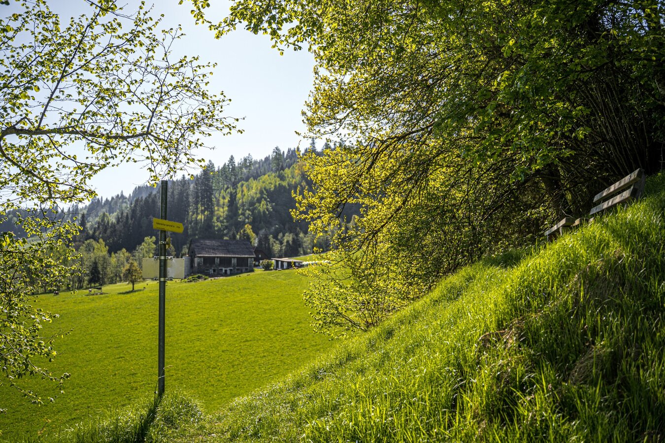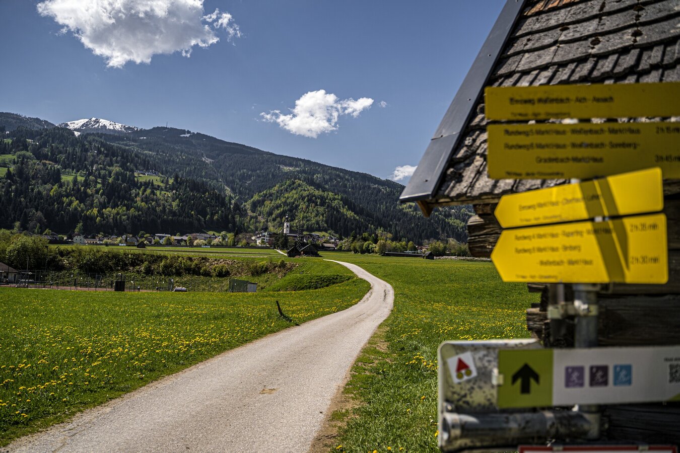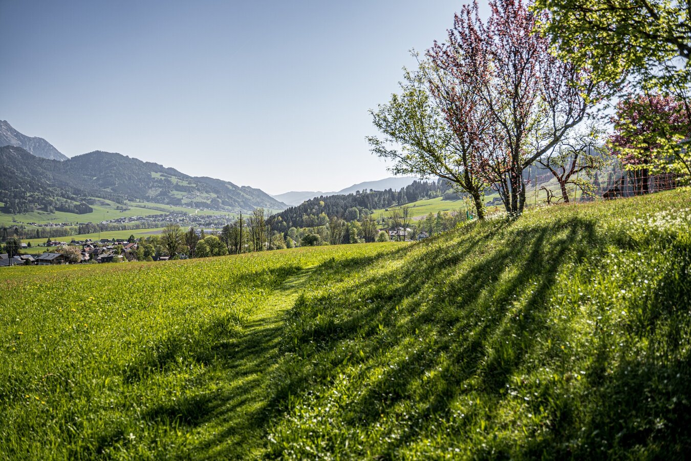 From the Schlossplatz in Haus head east along Junghannsstraße to the Hauser Kaibling 8-seater gondola valley station - meadow path ascending to the village of Ennsling. Continue via Lacknerhof, Rosspointnerhof and Mühlbacherhof to Ruperting/Kapelle. Head east towards Danzhof and on the Niederberg. Panorama road downhill to Höhenfeld and at the junction through the underpass in the direction of Weißenbach. Continue over the level crossing to the Enns bridge. Turn left immediately before the Enns bridge. Head west along the Enns to the suspension bridge below the Haus outdoor swimming pool. After the outdoor pool, continue through the underpass to Markt Haus.