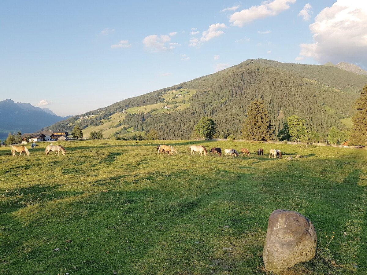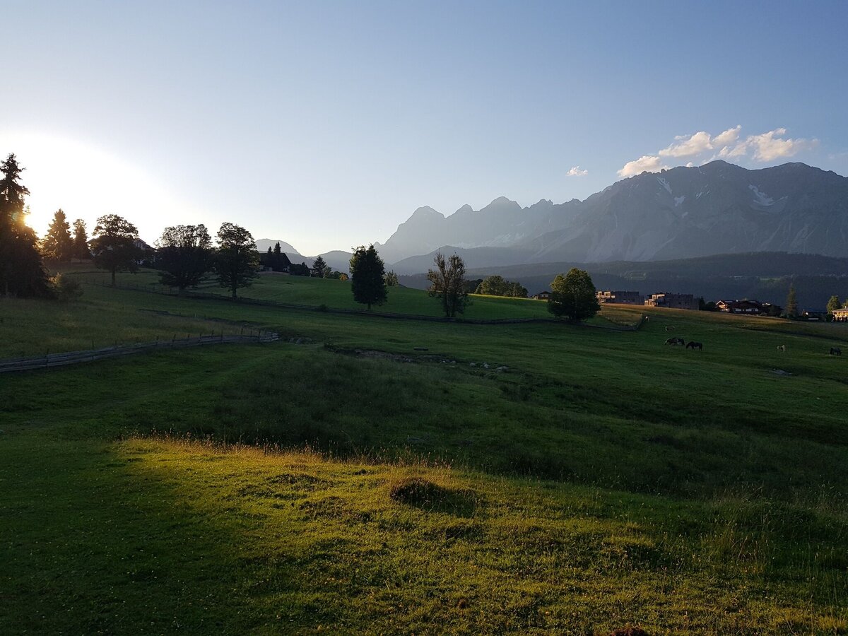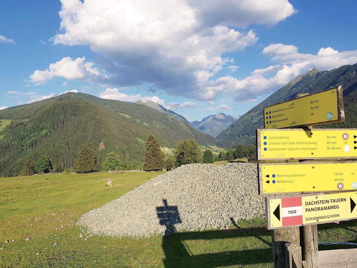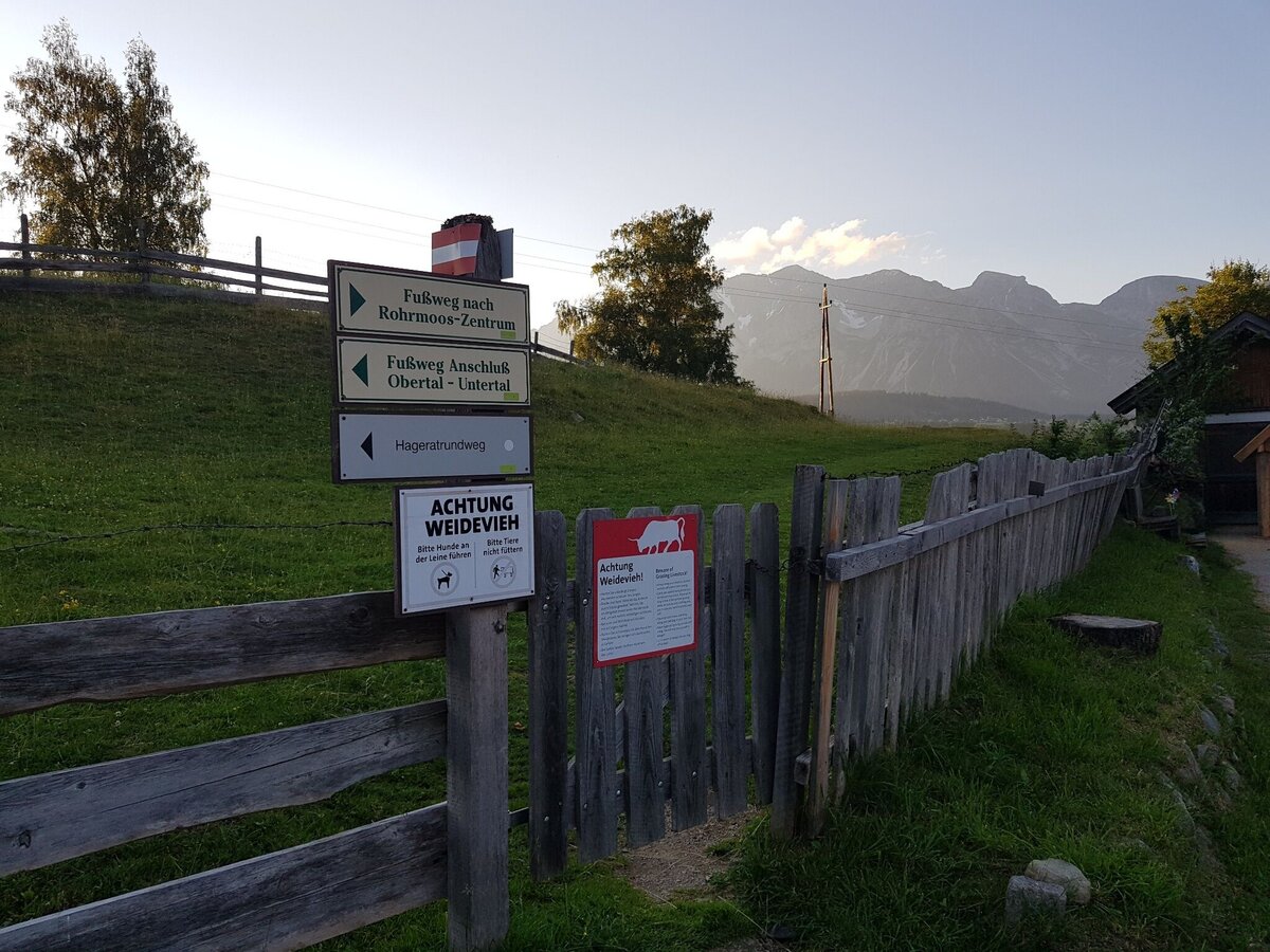 You start your walk towards West via Reiterkreuzweg road until you reach the trail junction "Reiterkreuz" after about 10 minutes. Here you make a left towards "Schußbühel" and walk on to Rohrmoosstraße road. You walk across the road to "Schußbühel" and then continue on across the meadows of "Rohrmooser Frei" to the corner of the second fence (near the valley terminal of Obertalbahn lift). Make a left at the fence corner and walk downhill to the trail junction "Rohrmoos-Süd". Just before you reach the road, make a left at the corner and walk to restaurant Braunhofer's. Passing bei the "Braunhofteich" pond you then make a right and walk the meadow trail downhill to the kindergarden. Here you make a left and walk back to the village center of Rohrmoos.