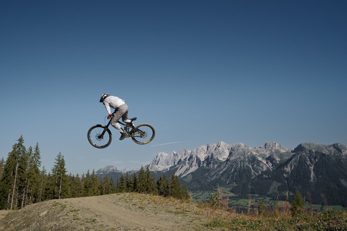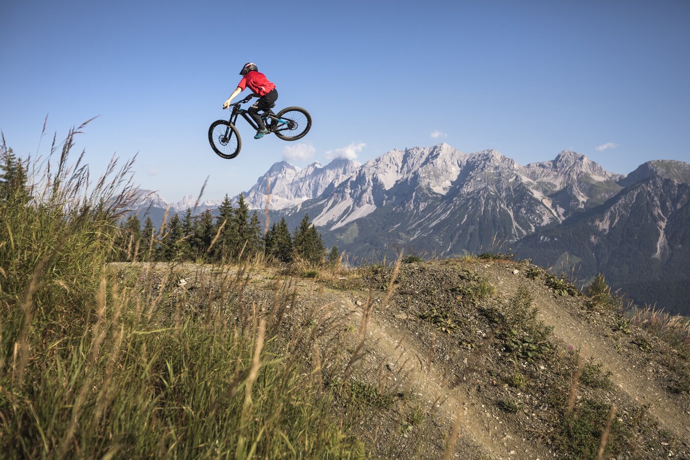 Access is via the Jumpline. The entry point is at the junction of the 99 Jumpline and the Peak Flowline. A special highlight: the breathtaking view with an unobstructed panorama of the Dachstein mountain range – combining riding fun with stunning scenery.