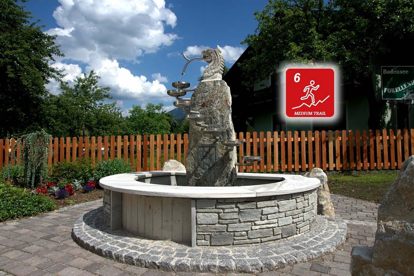 Village square Aich - railroad crossing - Enns river bridge - hotel Bärenwirt - turn right - follow the path next to the Enns river until Friesach - Friesach - meadow path back to Aich - first crossroad after the main road overcrossing turn right - war memorial Aich - Assach - at the fire department Assach turn left - Schoarweg - Zaunerweg - down into the part of Aich so called Langtrum - pass the farm houses Arnoldhof, Kainreiterhof and Gästehaus Aigner - crossroad Millereck - turn left and back to village square Aich