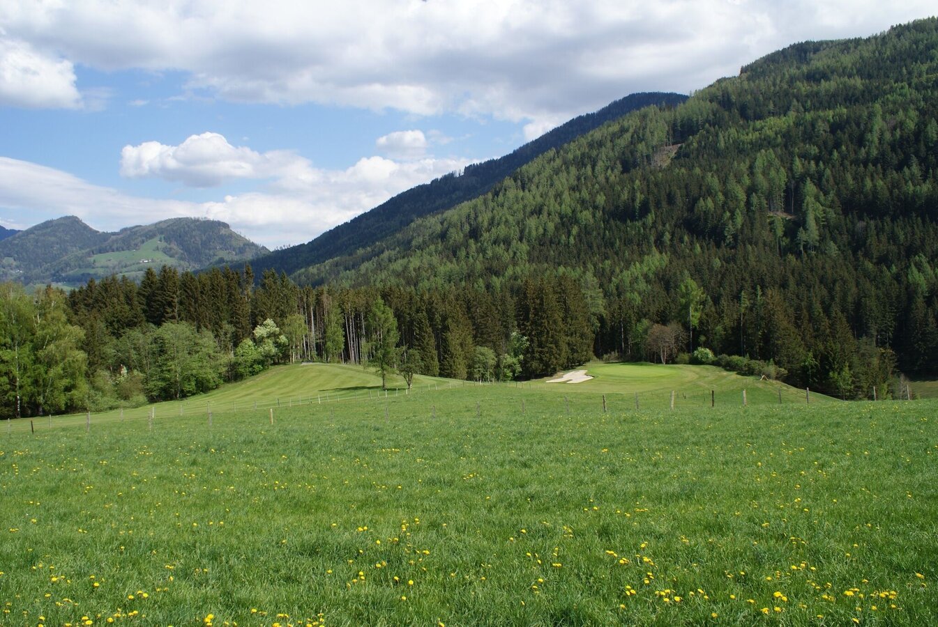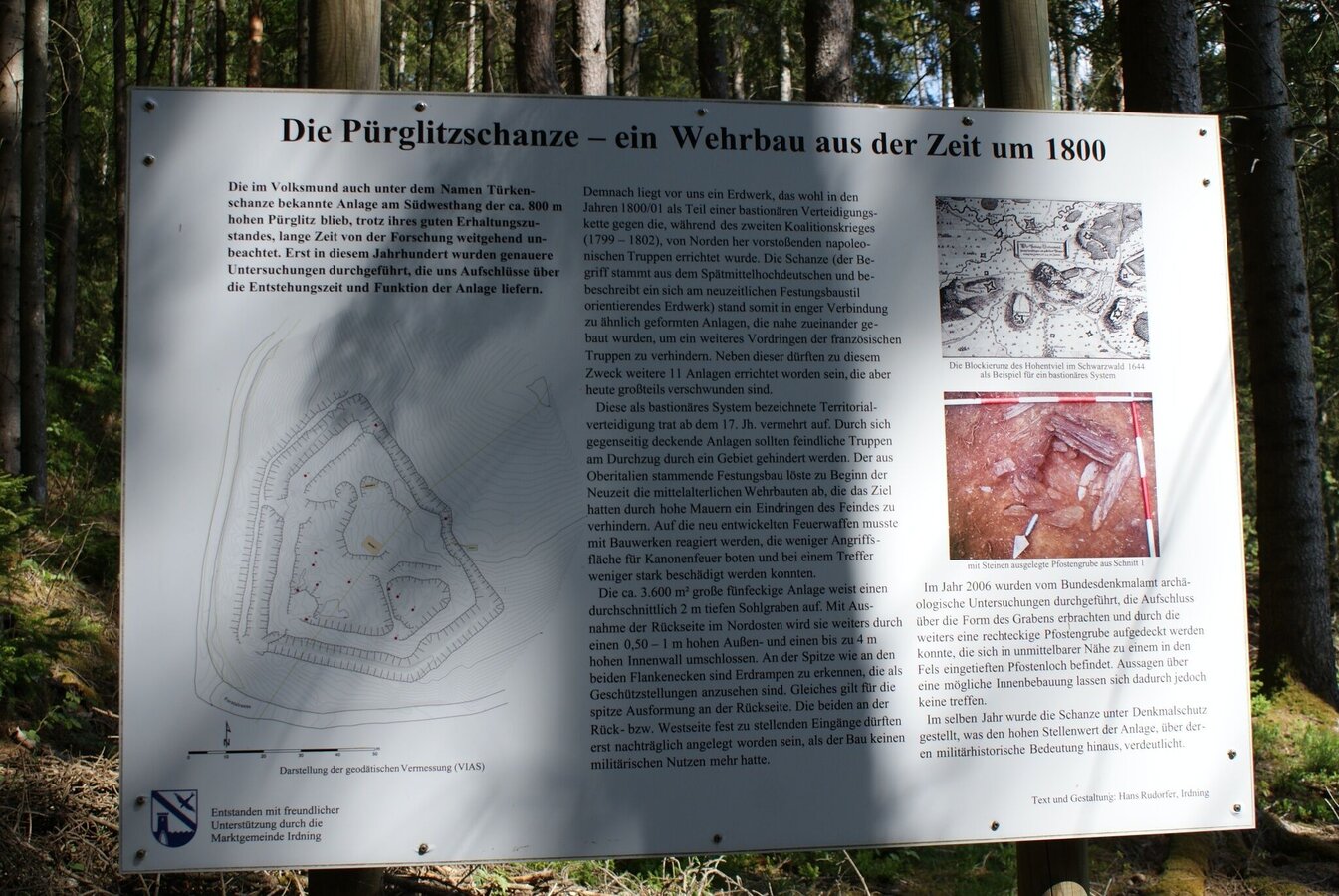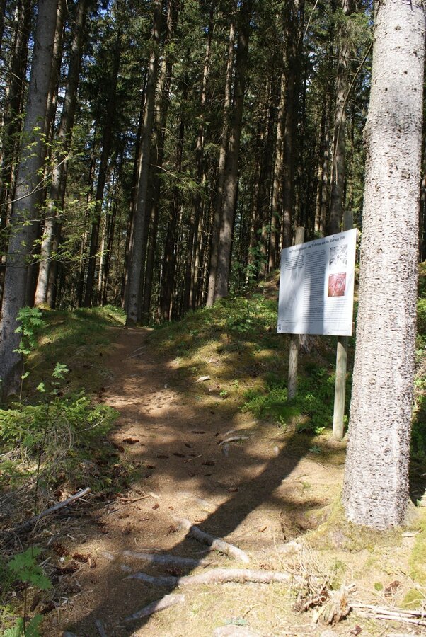 Continue along the field path to the road. Turn left there and continue straight on past a few houses until you reach a pile of wood at the end of the road. By the way, on the right side you see the golf course of Pichlarn. Past the wood pile the path leads downhill into the forest. After only a few meters you can take a short detour (about 5 minutes walking time) to the left to the Pürglitzschanze - an old fortification.