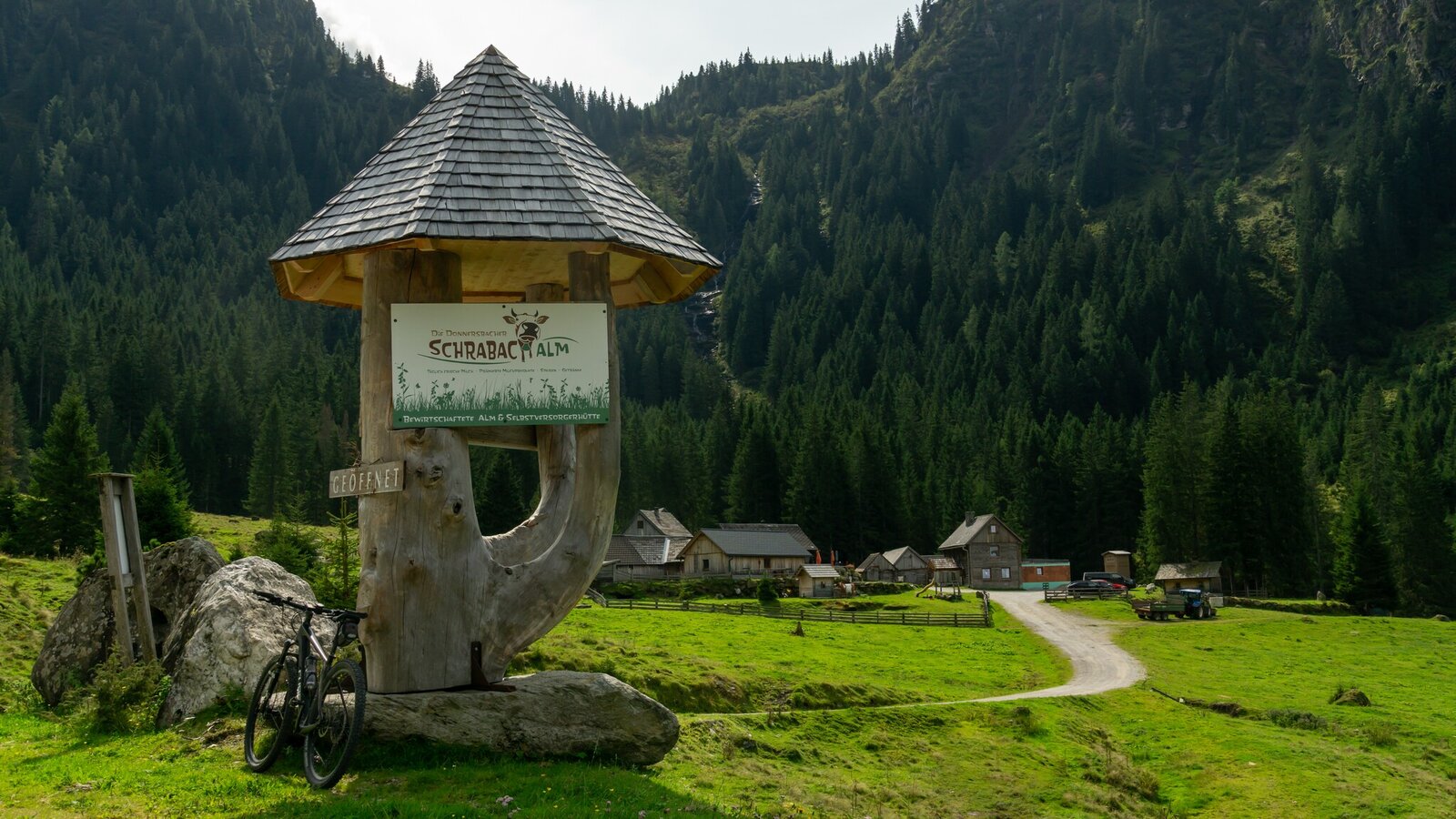 JAGGEDLY ON D'OIM. This mountain bike loop starts in Donnersbach and takes you steeply uphill via the Plannerstraße, passing the Ertlscheigerhaus and the Schrabacherhütte to the Planneralm. Here, you'll be rewarded with stunning views and alpine delicacies. The return route leads via Schaablehen (accessible from June 15) and takes you back to Donnersbach on varied gravel paths.