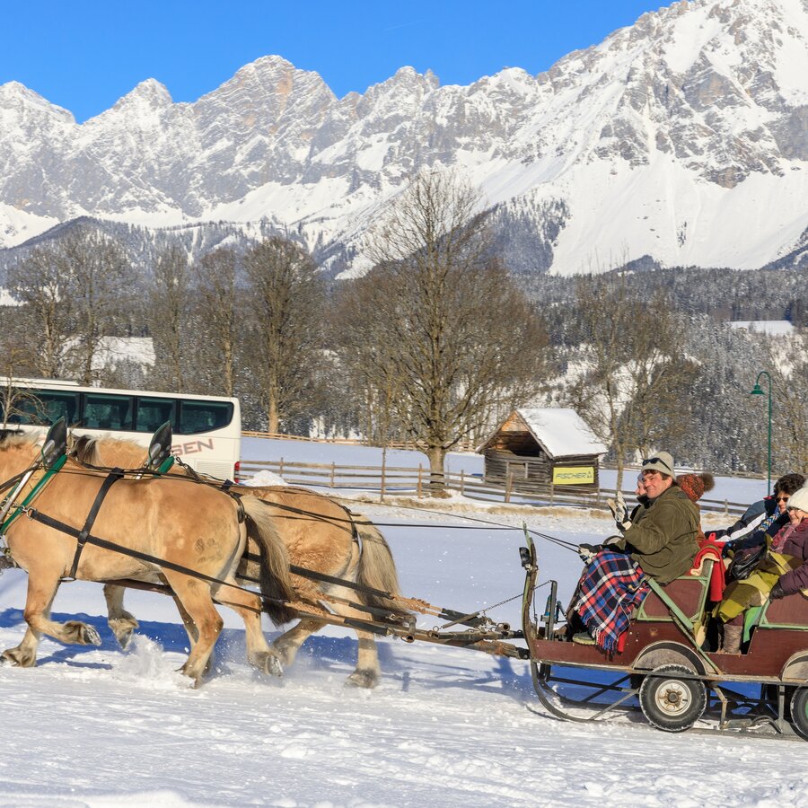 From the sleigh ride meeting point at Rohrmoos village the tour first heads along Rohrmoosstrasse and Tälerstrasse roads to the "Ahornweg" turn-off at Obertal-West. Passing by several nice farm houses the tour makes a small loop into Obertal, where you will enjoy the fresh winter air. Before getting back to the starting point in the village of Rohrmoos the tour also takes you across the sunny meadows of Rohrmooser Frei. Remark: of course the route always depends on the weather conditions and firmness of underground!