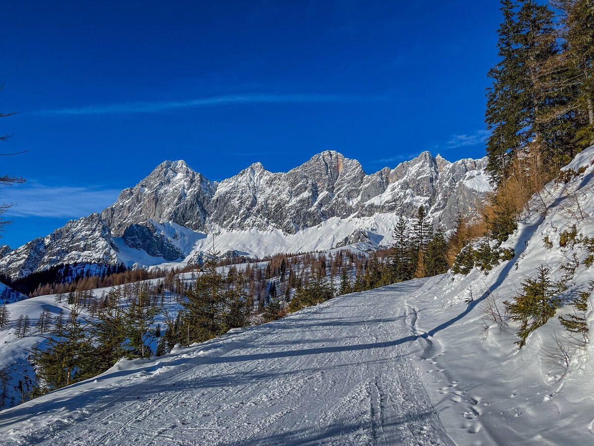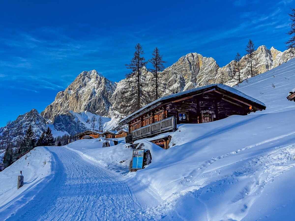 This ski tour for beginners starts at theParking lot Edelbrunn. From there, follow the ski trail to the Dachsteinhaus above the lift station. The ski trail will then lead you to Brandalm. On this tour, you can enjoy a beautiful view of the Dachstein Südwand. The final descent is via the ski trail and the ski slope.