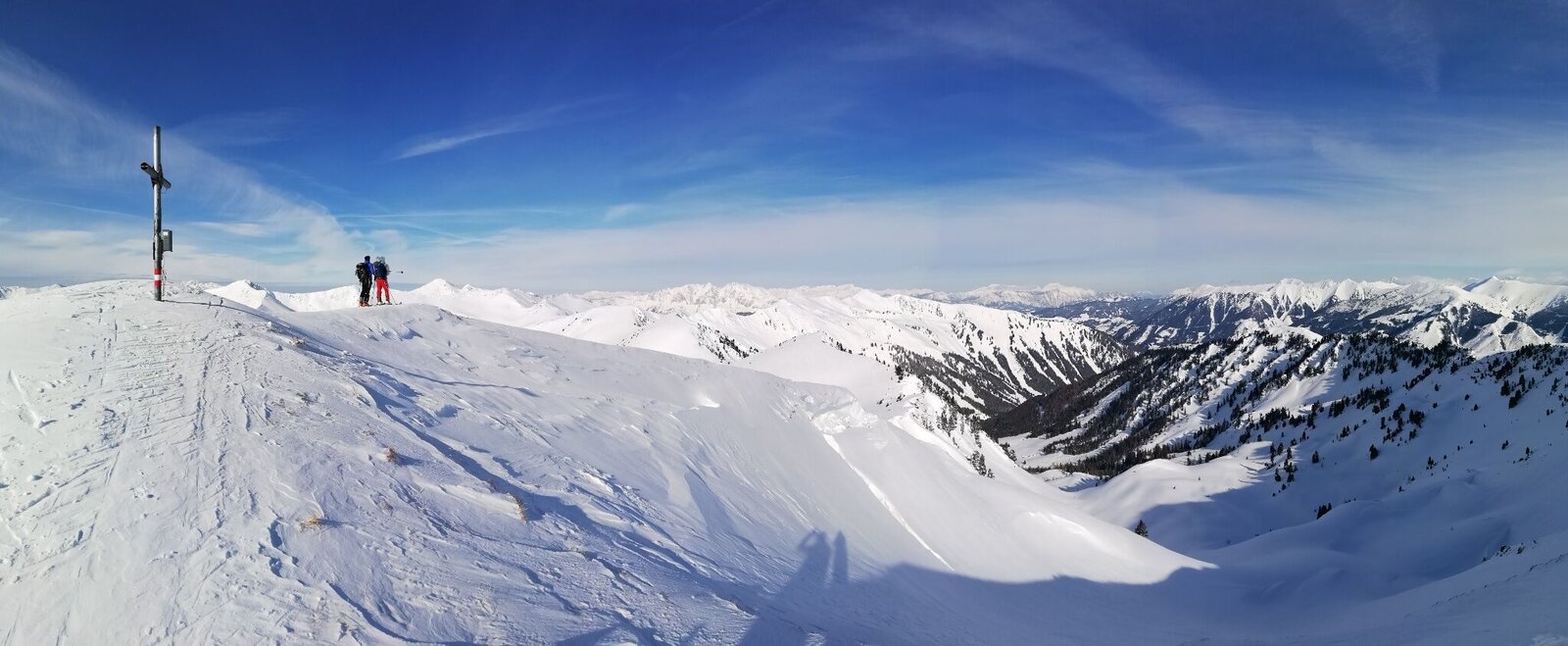 The ski tour starts at the parking lot in the village center and follows the prepared forest road to the managed Vorderen Mörsbachalm. From there, then crossing the stream and slightly ascending further to the Hintere Mörsbachalm at 1482m. The now following steeper ascent, called "Guglhupf" by the locals, brings you into a wide cirque, which you do not follow completely. You turn to the east before and climb steeply on a pronounced ridge. Here it can be dangerous for avalanches. From this ridge you climb slightly to the summit of the Großen Bärneck (2071 m) with the beautiful summit cross. A magnificent panorama of the surrounding mountains opens up here.