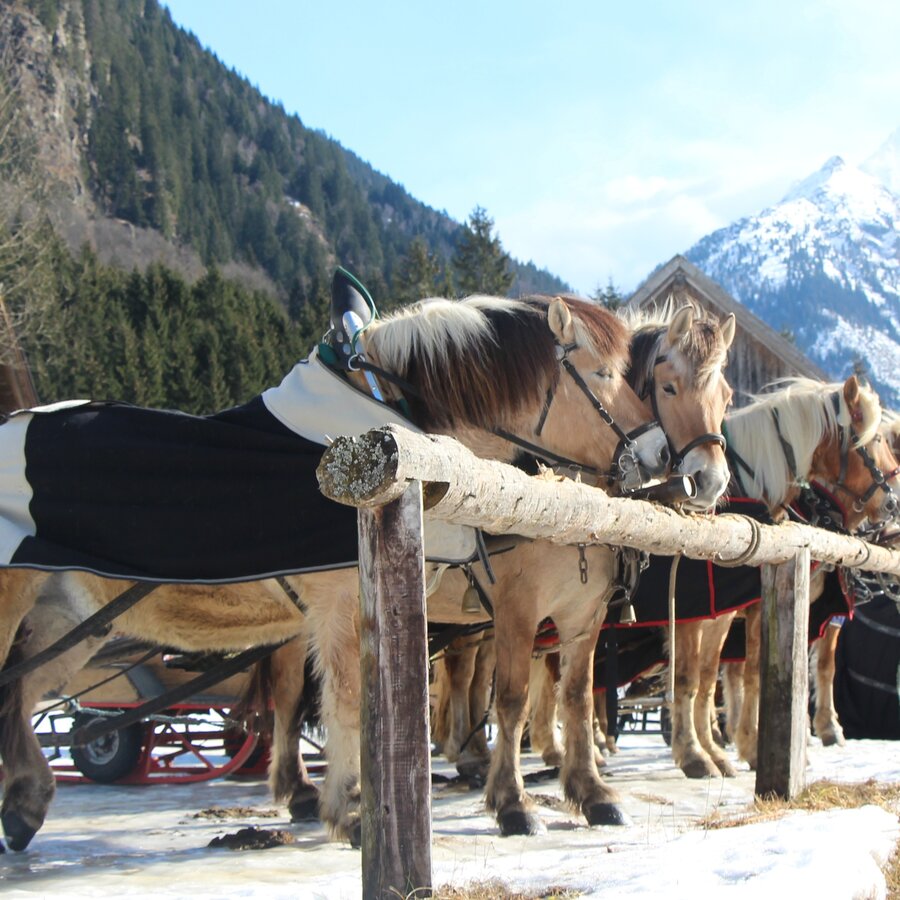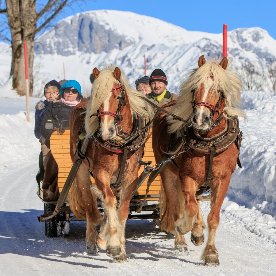 There is a minimum fee per sleigh. Additionally the prices depend on the length of the tour agreed upon with the respective provider. Kids up to 10 years get a 50 % reduction. If the ride ends after 7 pm there is a night shift premium! Rustic alpine chalets along the way invite you to enjoy a refreshment stop – out on their sun terraces or next to a warm, cozy tiled stove, sipping on a mug of hot chocolate or spiced wine.