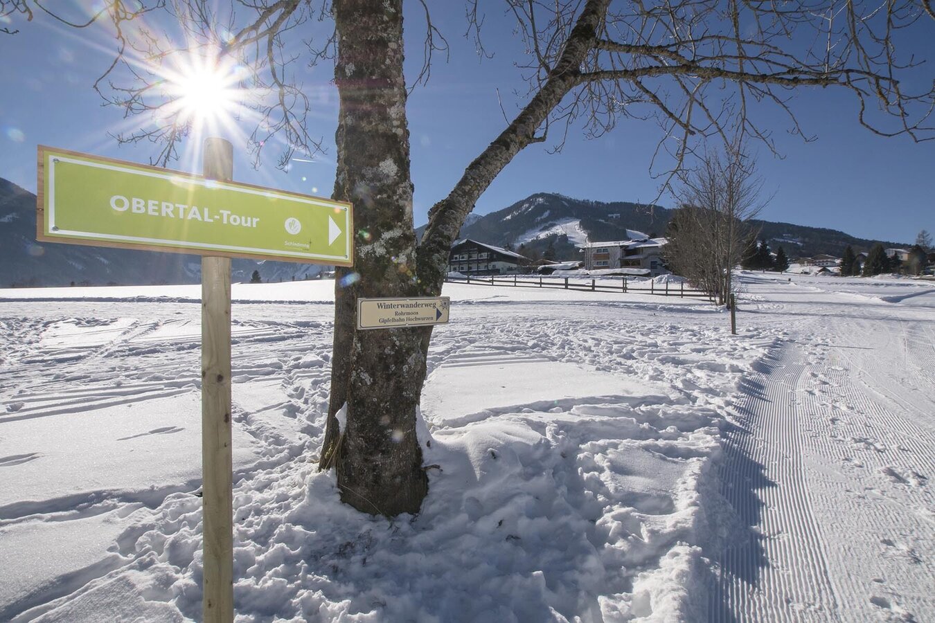 From Rohrmoos you walk uphill, from the valley terminal downhill to the meadows of "Rohrmooser Frei" (below the valley terminal of Obertalbahn cable-car). From here you start your way into Obertal valley - just follow the signs "Obertal-Tour" with the snowshoeing symbol. You pass by the farms Sonnleitner, Holzbacher, Pocher, Finsterl, Talhammer and Hochegger until you reach the charming meadows near the Rojerhof farm. A couple of minutes further you reach Windbacherstube Inn (permanently closed).