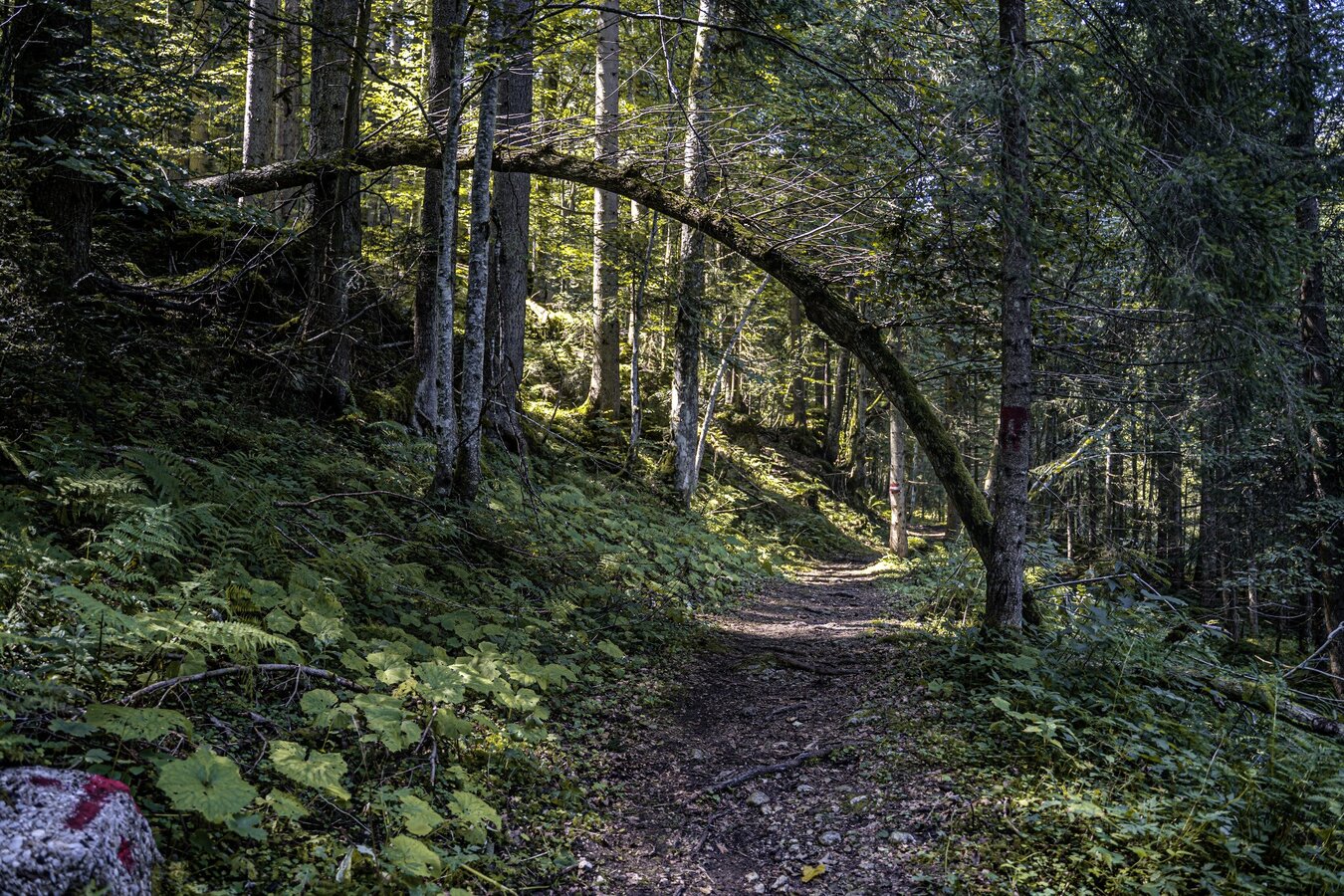 From the starting point GH Weitgasser, this trail also first leads over the Fürstensteig in the direction of Stainach, where the first real climb then leads up to the Leistenalm. After a few meters in altitude, you pass directly by the Spechtensee. From there it goes first still over an asphalt section, until it goes again over a forest road in the direction of Aicherlkar. Forest paths, single trails and an alternation of up and down passages lead you past the Aicherlstein.