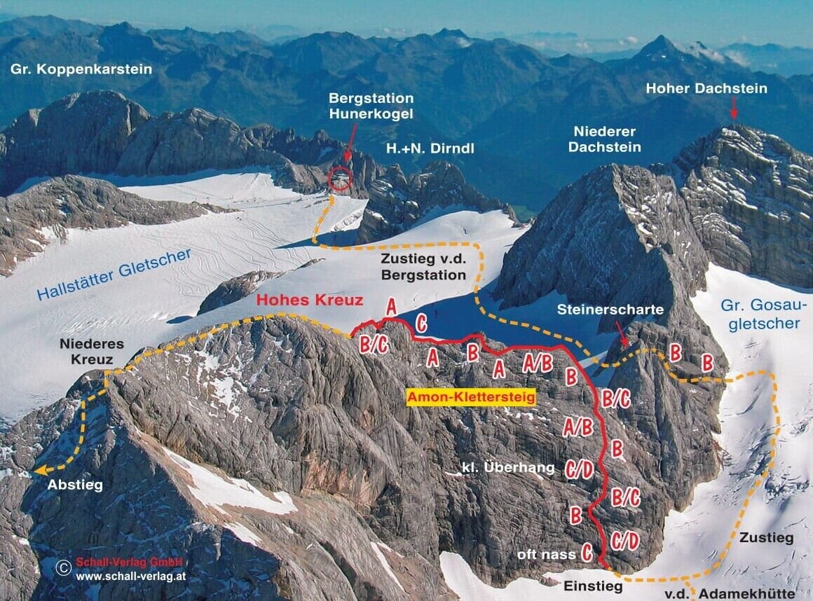 From the top station of the Dachstein cable car until shortly before the Seethalerhütte, past the Steinerscharte to the Simonyscharte. This is the beginning of the safty cables for the upper portion of the Amon Klettersteig (C).The complete Amon Klettersteig can be reached via the Steinerscharte to Gosau glacier (constant danger due to crevasses), dropping down to directly below the west face, where you will find the start of the actual climb (C/D).