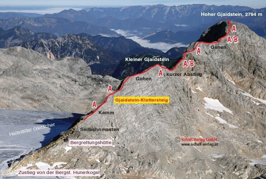 Access: Take the short hike down across the glacier from the top of the Dachstein Gondola to Gjaidstein’s entry point. Pass the mountain rescue hut to get to the start of the secured climbing path.
