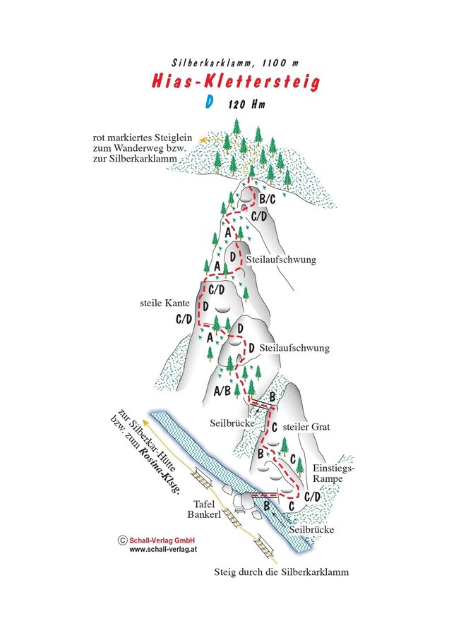 At the end of the Via Ferrata, follow the red markings. Take a left and hike back down to the gorge. Alternatively, take a right up to the Silberkarhütte and hike up to the entrance of the Via Ferrata Siega.