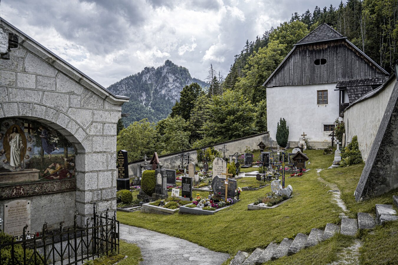 From the north exit of Stainach-Irdning train station, head left/west and then turn right onto Dr.-Frank-Allee. Walk slightly uphill to the main road and cross it to the sidewalk on the other side. Walk to the left to the Red Cross and immediately after, turn right onto Schlossweg. At the first fork in the road, keep left and walk out of Stainach toward Pürgg. The gentle climb leads below the Rantenstein through the forest to Pürgg. You first reach the Schwarzbauer farm and walk down its access road to the eastern end of the small village. Now walk into the village, past the Johanneskapelle Chapel to the intersection by the fire station. Uphill to the right, you can take a small detour to the swimming pool with the Kleines Café, and downhill to the left is the Krenn Inn and the parish church.