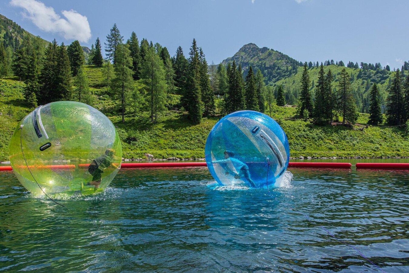 SchafsinnTeich Hauser Kaibling: Walk across the water? Without even getting wet? What sounds like a biblical miracle is great summer fun for young and old. On the banks of the Kaiblingalm reservoir, you can climb into giant balls every day from July 1 and simply walk across the cool water.