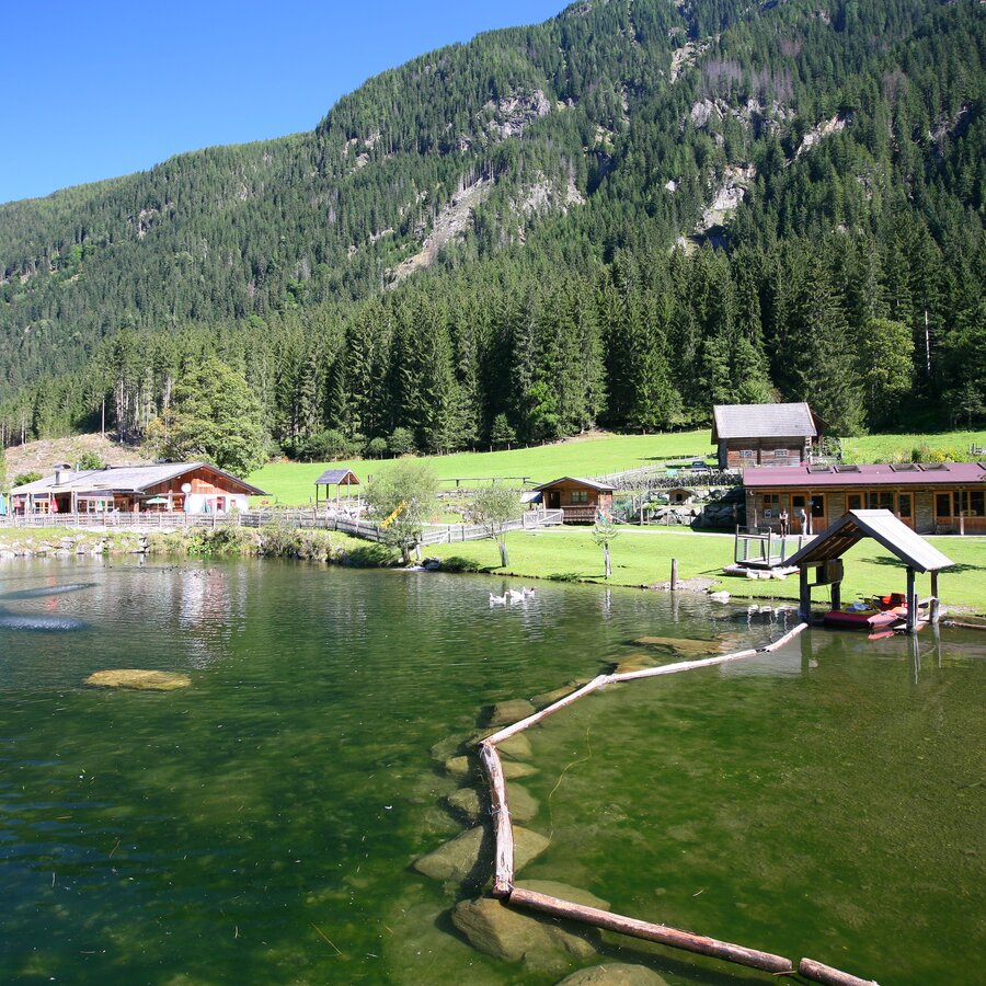 From Hinkerbrücke car park, you will walk towards Gasthof Tetter. Above Tetter moor you will encounter many info points relating to the water theme, finally coming to the Waldhäuslalm, a fun place for adults and children with a fish pond and a big playground. Just a few meters further and you can cross the stream, now following a charming path between the water and the forest to the rustic Sondlalm, where there are animals to pet including rabbits, hens and goats. A detour to Gasthaus Weiße Wand (ca. 200 m away) is also rewarding, especially since mini mountaineers get to give climbing a try. The variety-packed, family-friendly path now leads you to the finish of this stage, the Seeleiten car park at Riesach Waterfall. This is also the trailhead for the next stage, the alpine trail ››Höll‹‹.